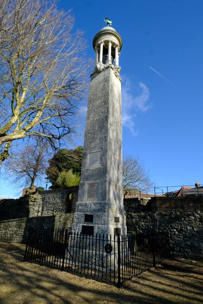 Just outside the park by the city wall is the Mayflower Memorial It commemorates the sailing of the Pilgrim Fathers to America in the Mayflower and Speedwell in 1620. The monument is a 50 ft high column of Portland Stone, surmounted by a cupola and a copper model of the Mayflower.