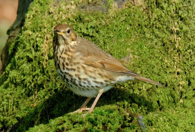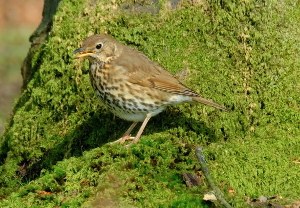 A Song Thrush. One of this bird’s favourite meals are snails – which they break into by smashing them against a stone with a flick of the head. This one was feeding in the forest under fallen leaves looking for worms and insects.