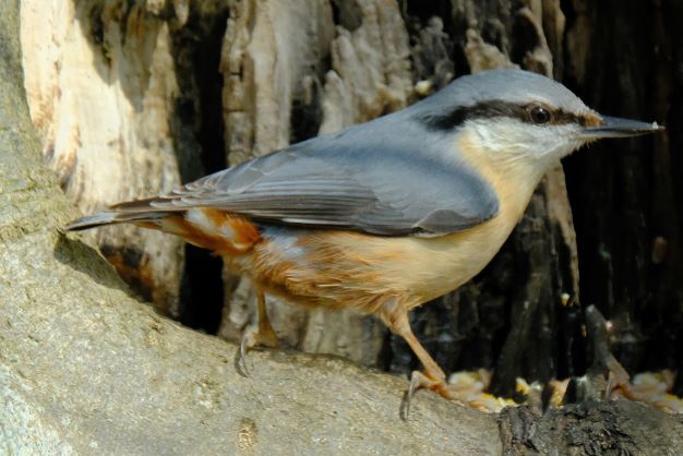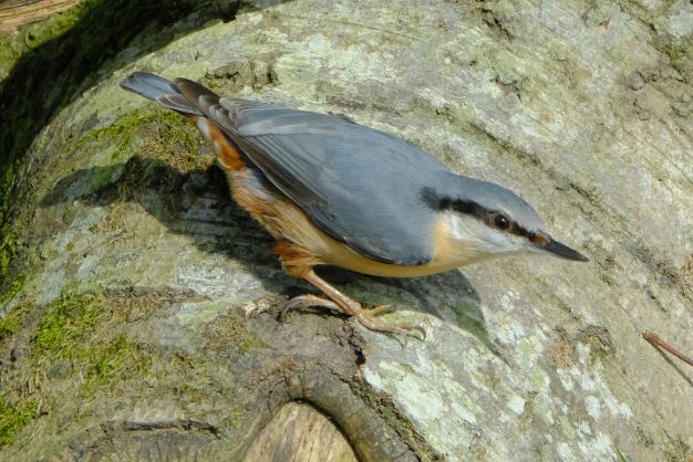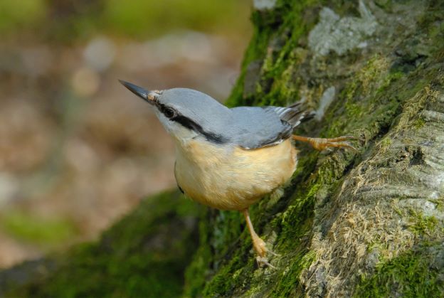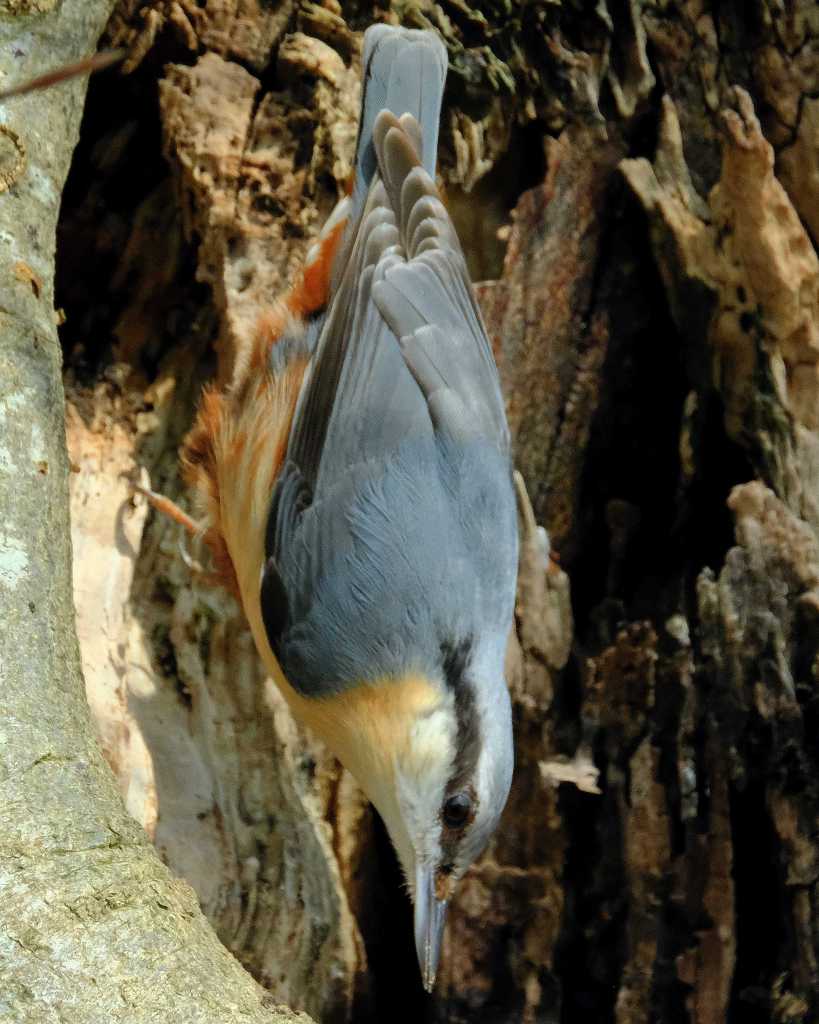 A Nuthatch is an interesting small bird as they will climb down trees and well as up while looking for a meal. They hold on to a tree from all angles.