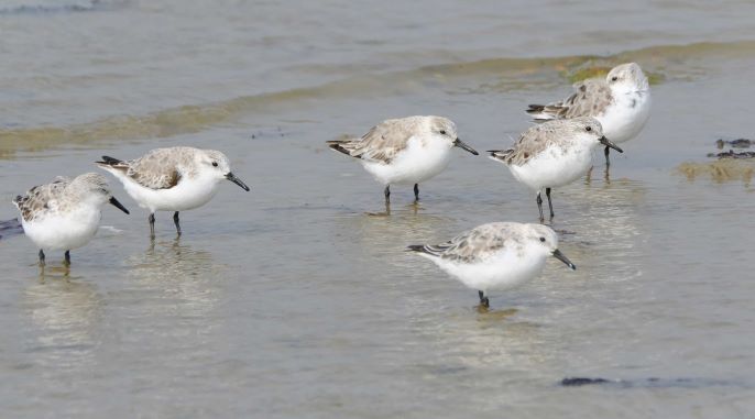 Seven Sanderlings were on Meon Shore yesterday morning feeding on the incoming tide I had not seen any for several weeks normally by now most have returned to their Arctic breeding grounds and I thought they had all left. Normally I see only the odd bird this time of year which has decided to stay on our shores. Interestingly these birds remain in their winter plumage and not changed to their breeding colours where their backs heads and wings change to a light brown.