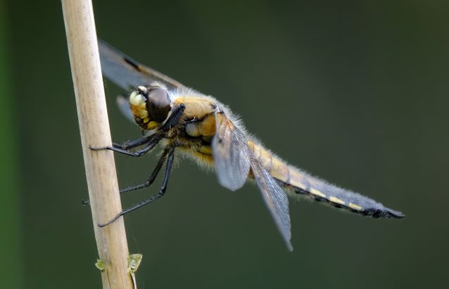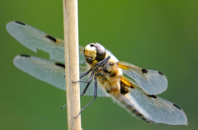 The Four-spotted chaser is easily recognised by the two dark spots on the leading edge of each wing – these spots give this common dragonfly its common name. It can be seen on heathlands and near ponds