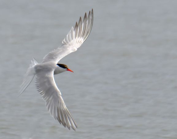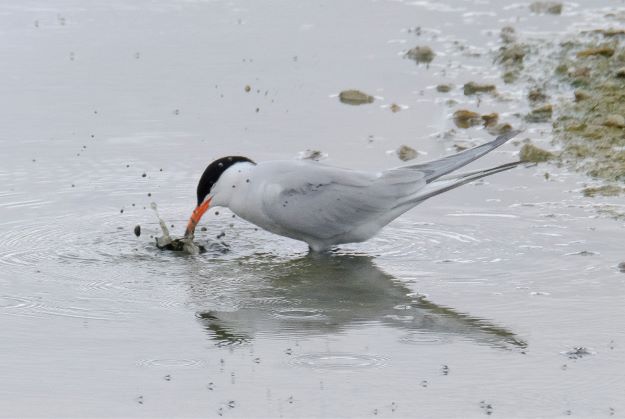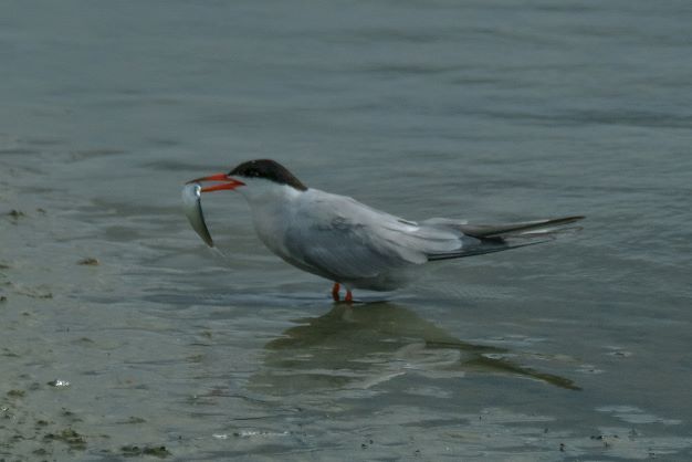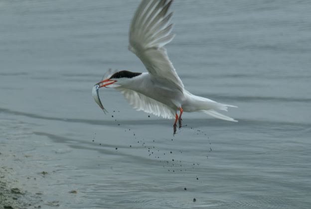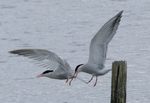 Common Terns are silvery-grey and white birds with long tails that have earned them the nickname sea-swallows They are graceful flight and frequently hover over water before plunging down for fish. They are often noisy. Each year nesting colonies are good at Titchfield Haven. UK breeding:12,000 pairs. I always look forward to their arrival in April and notice their absence when they leave in late August or early September. They migrate South to Africa after the breeding season.