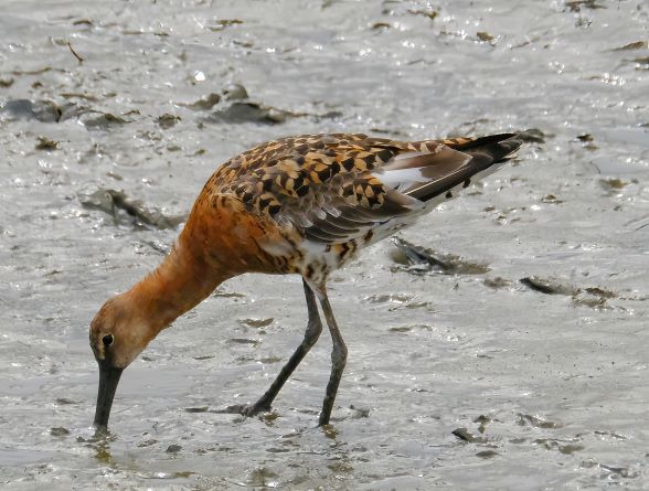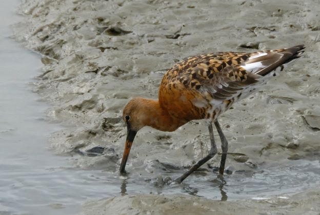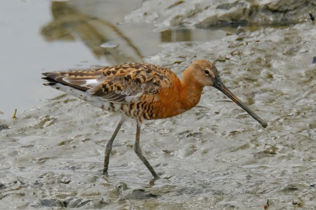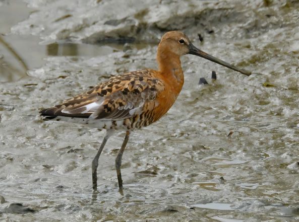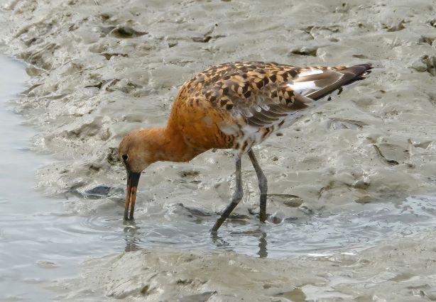 This Godwit colour varies depending on its age and the time of year. The male in summer has a stunning colour pattern with a chestnut brown head and neck. The underside is barred with dark brown stripes.