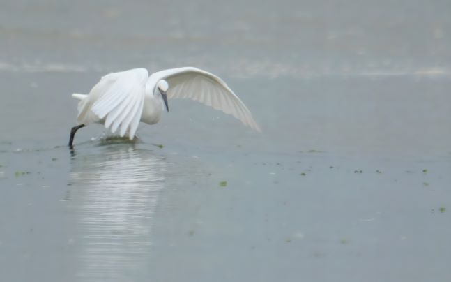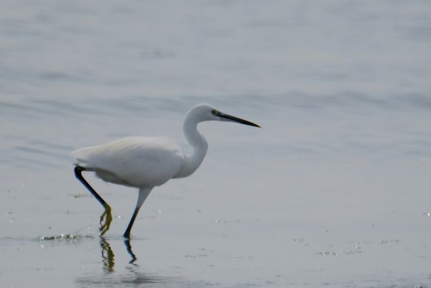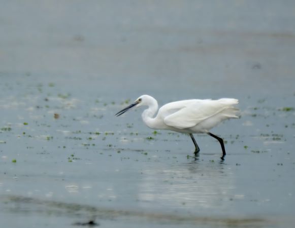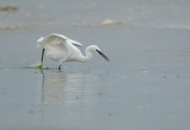 A solitary Little Egret quietly fishing as the tide comes in. This morning the rain arrived and the beach was almost empty of people I was able to sit down on the shingle and enjoy this egret going up and down and catching small fish.