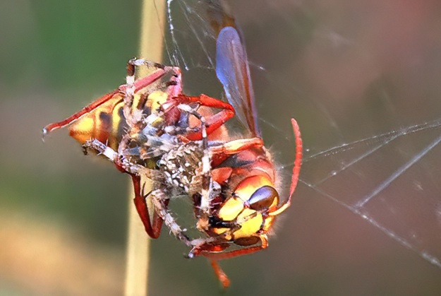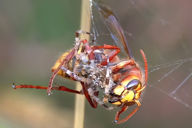 Watching a Hornet and trying to get some photographs of it it appeared to get caught in a spider’s web. This turned out to be an error and what had actually happened was that the hornet was attacking the spider and making a meal of it. After killing the Garden Spider it flew off with its body.