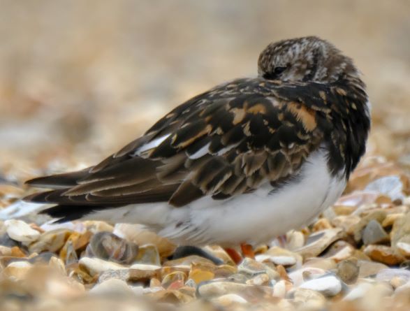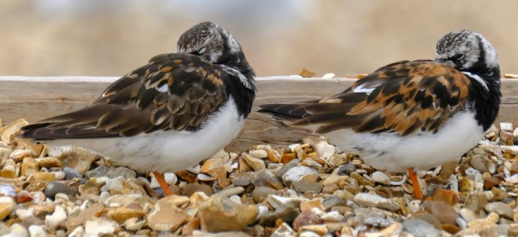 Turnstone on Meon Shore – The numbers of these little birds are increasing on our shores as they return from their arctic breeding ground to winter but they are present for most of the year in the UK as the non-breeding birds often stay through the summer. Birds from Northern Europe pass through in July and August and again in spring. Canadian and Greenland birds arrive in August and September and remain until April and May. Known in other countries as Ruddy Turnstone the “Ruddy” has been dropped here. Their colours are more muted in nonbreeding plumage. In the picture below the bird on the right shows breeding colours, the bird on the left colours has started to mute.