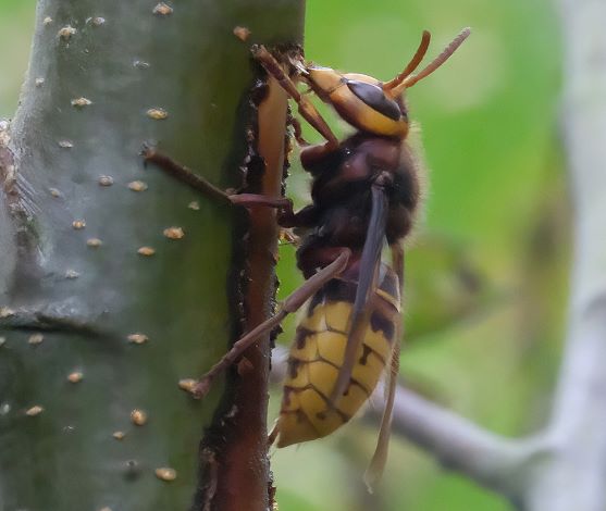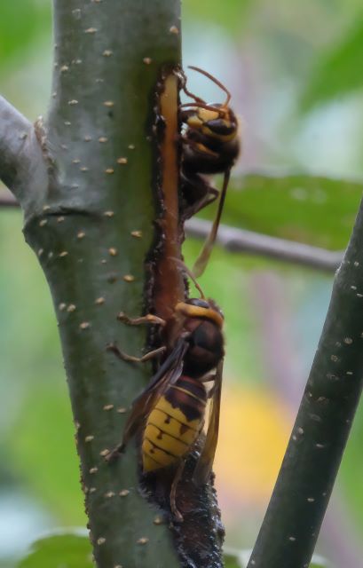 In the summer we spotted Hornets catching bees and spiders. In addition to eating insects, in late summer and early autumn they can be spotted feeding on fallen fruit and sap from tree bark. They engage in feeding on plant tissues beneath the bark of trees and shrubs. This feeding has been observed on many types of trees and shrubs. We spotted these Hornets today feeding on sap and you can clearly see where they have stripped off the bark on this sapling to get to the sap.
