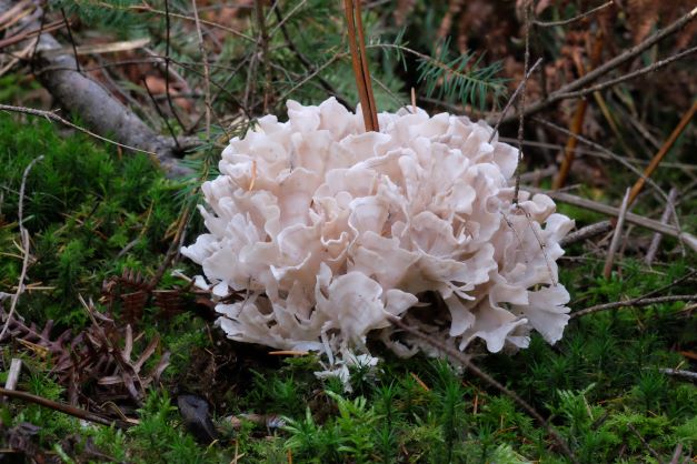Cauliflower Fungus, Wood Cauliflower, and Brain Fungus are uncommon. the visible parts of this fungi above ground are fattened lobes in colour they can be light brown, buff to yellow/grey to creamy white. They have no gills, but this mushroom has tiny pores. It is found on conifer roots, especially pine. It is claimed they are good to eat.