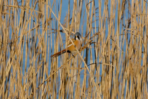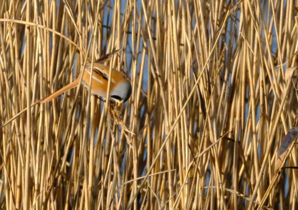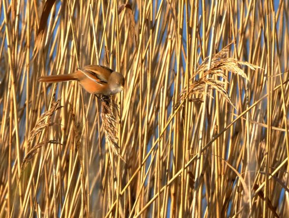 They are small brown, long-tailed birds, a bird of the reedbeds. Males have black ‘moustaches’.They are sociable and have a noisy, call.