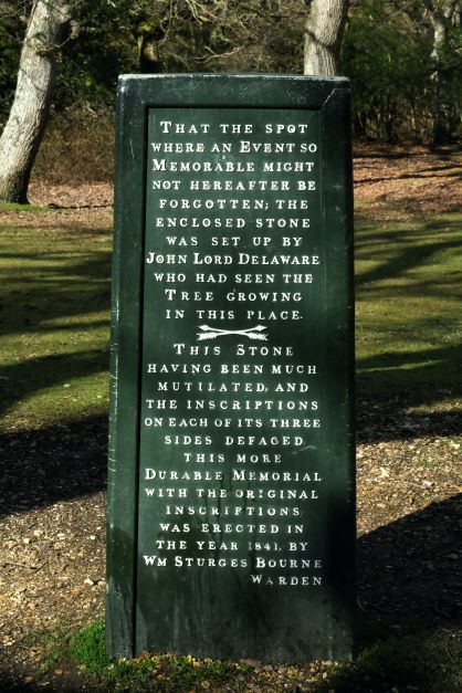 That the spot where an event so memorable might not hereafter be forgotten, the enclosed stone was set up by John Lord Delaware who had seen the tree growing in this place. This stone having been much mutilated, and the inscriptions on each of its three sides defaced. This more durable memorial with the original inscriptions was erected in the year 1841, by WM Sturges Bourne, Warden.