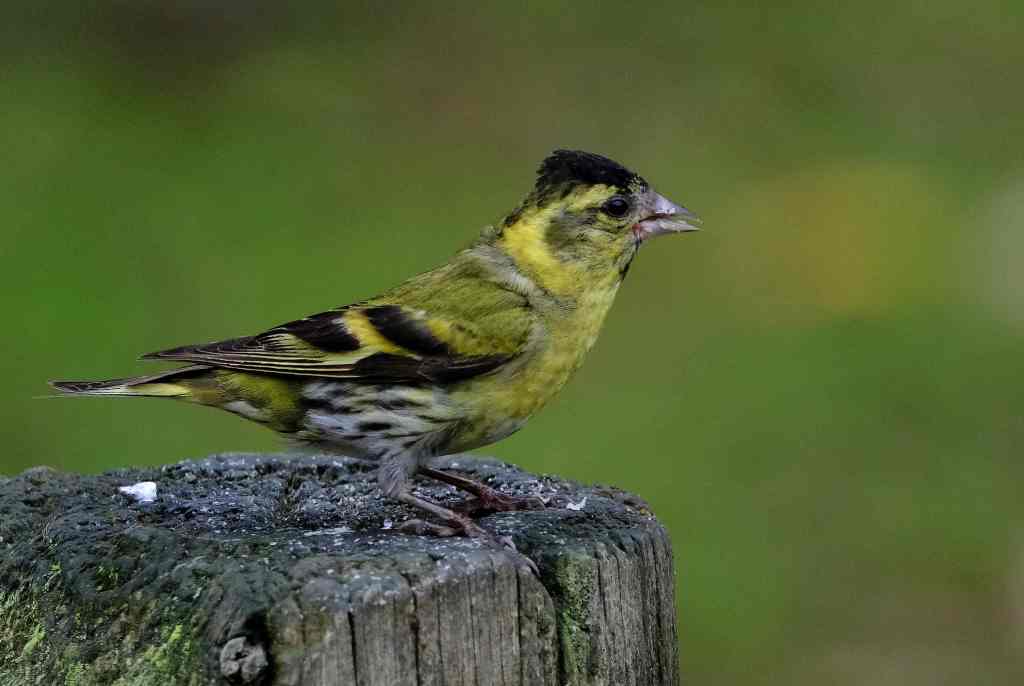The Siskin is a small, finch it has a distinctly forked tail and a long narrow bill. The male as pictured here has a streaky yellow-green body and a black crown and bib. There are yellow patches on the wings and tail.