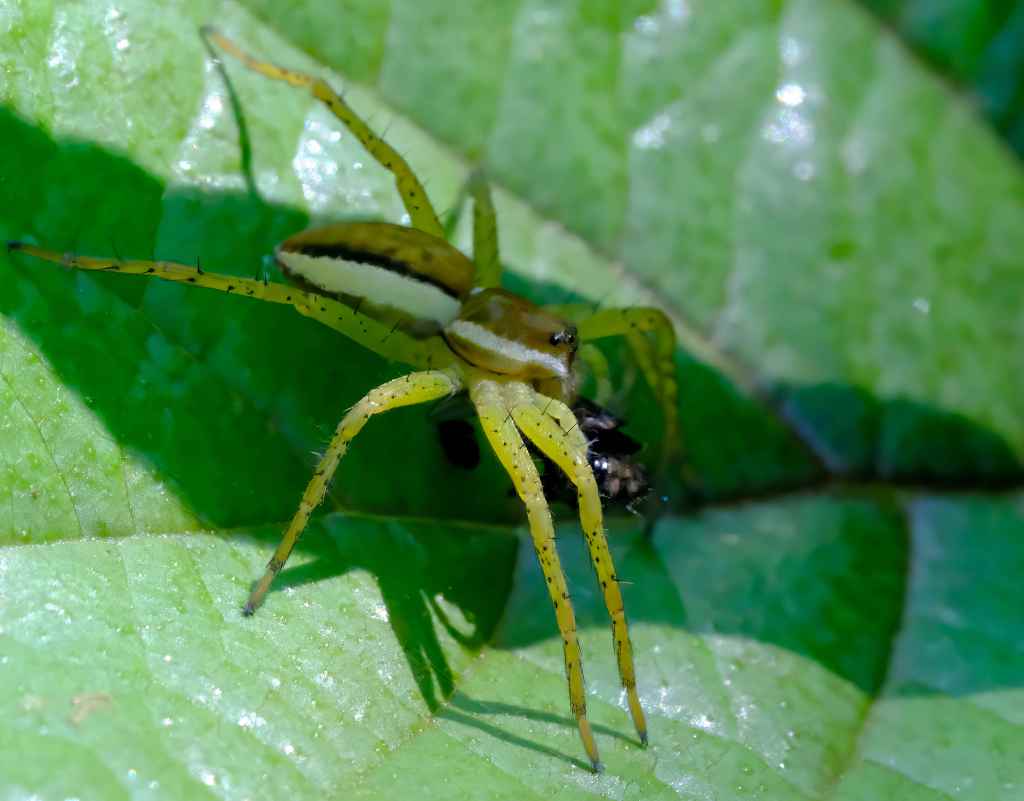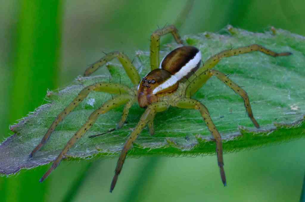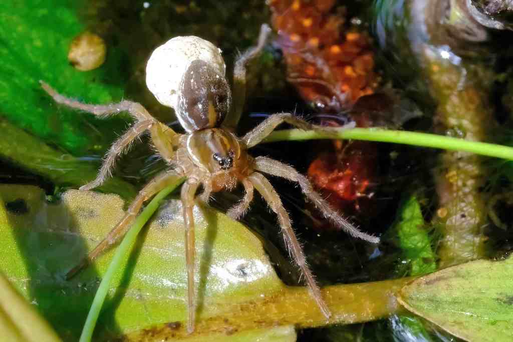 These large spiders will sit at the edge of the water, or on floating vegetation, with their front legs resting on the water’s surface in order to feel for the vibrations of potential prey, they chase out onto the water to catch their prey, ranging from tadpoles or small fish. They will also swim underwater.