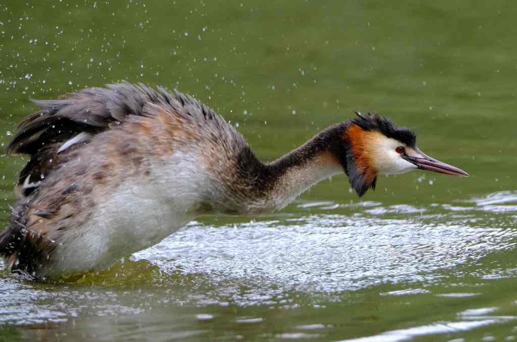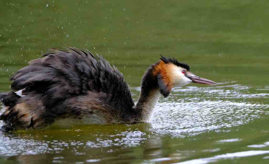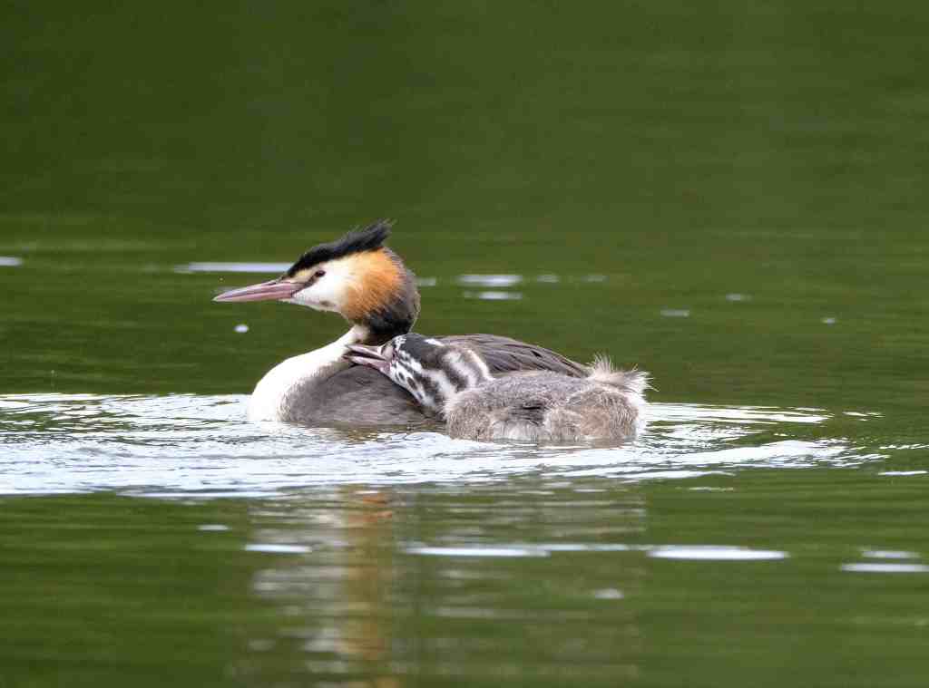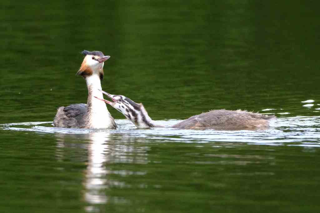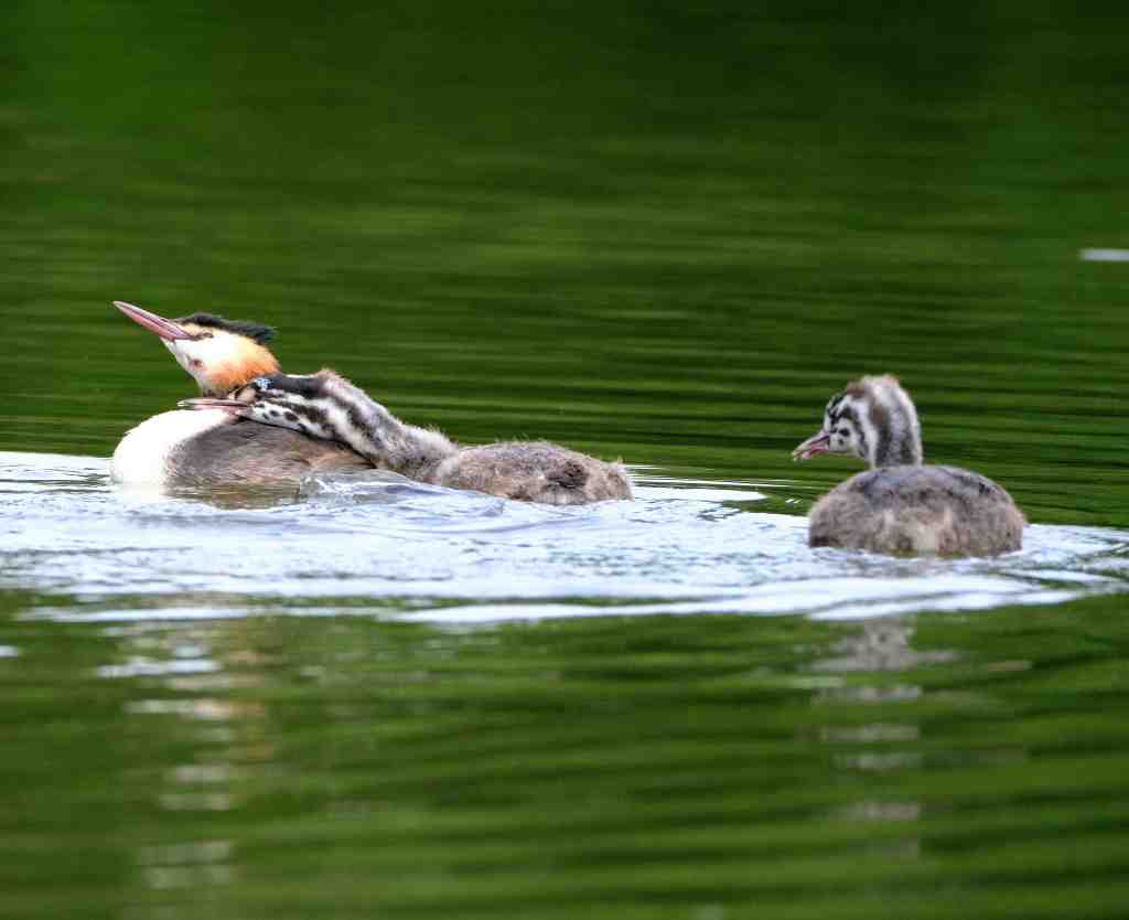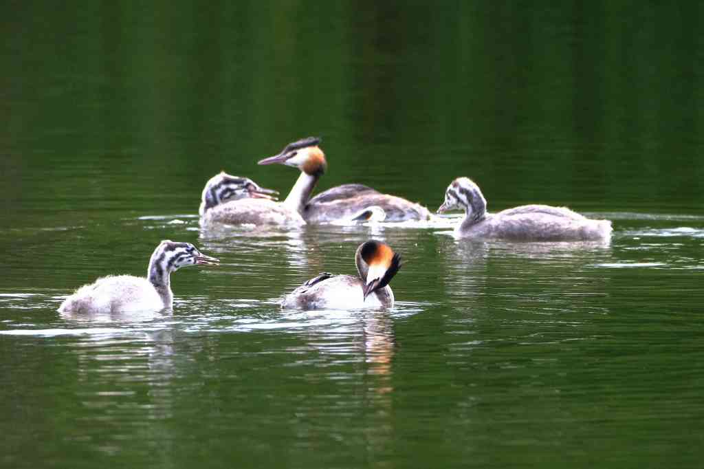 An update on past posts following the Great Crested Grebes family on a local lake. The chicks are growing well and all four have survived. They remain close to their parents but are fishing independently. The group comes together but a lot of the time 2 chicks stay with each parent bird.