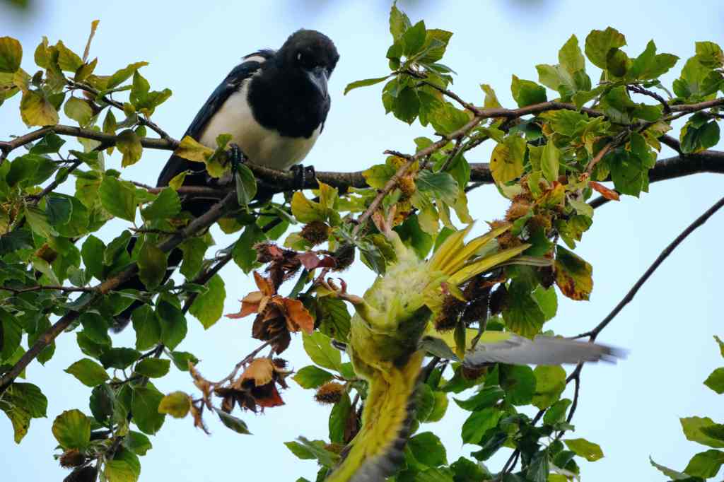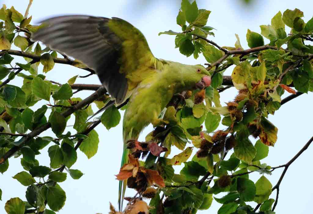 Four Ring-necked parakeets were high in the Beech trees eating the beach nuts. With their strong beaks they can easily remove the nuts from the husks. At this point the Magpies try to steal the nuts.