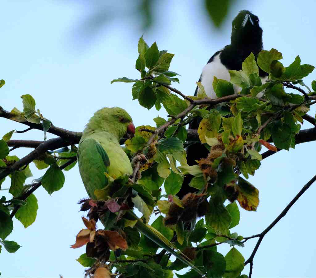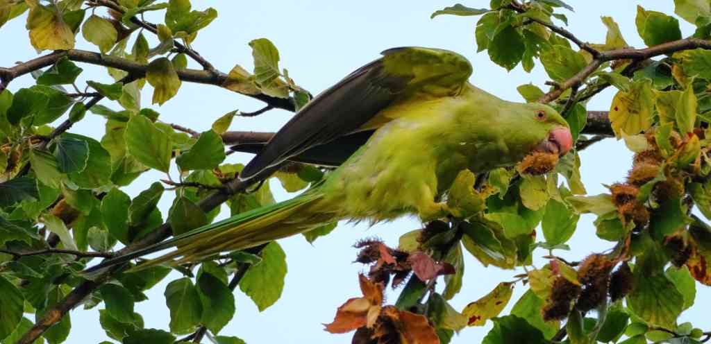 Garden visitors or just passing through. Yesterday morning I thought I was dreaming as I woke I heard parrots! The noise got louder and interrupted by the cackle of Magpies. Our garden is small and divided at the bottom of the garden by large Beech and Sycamore trees.