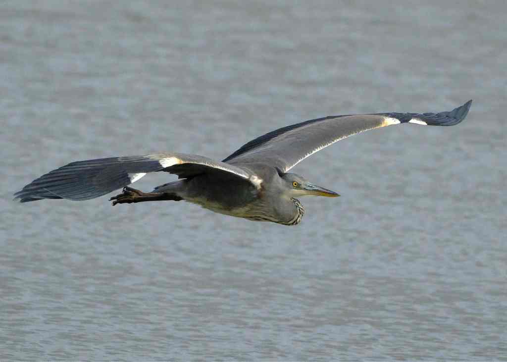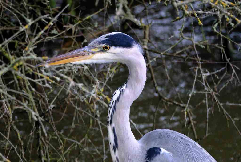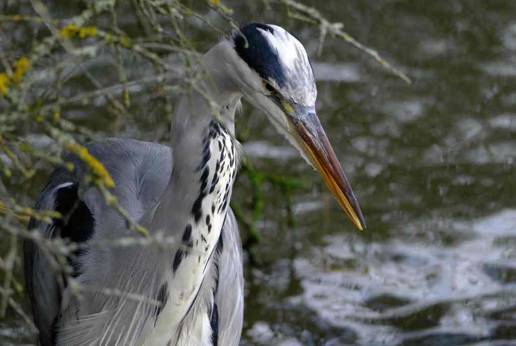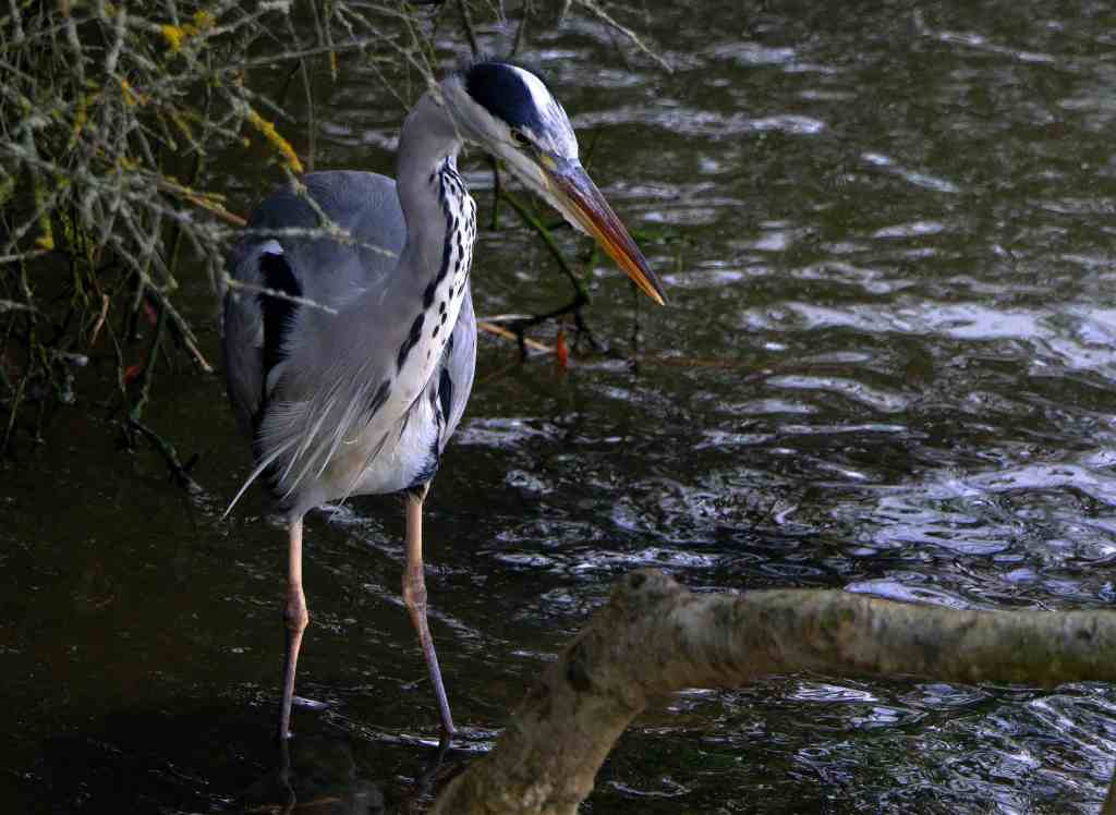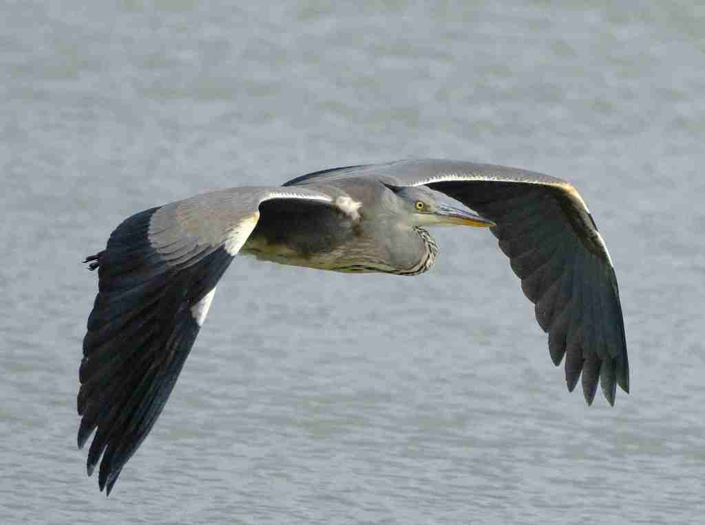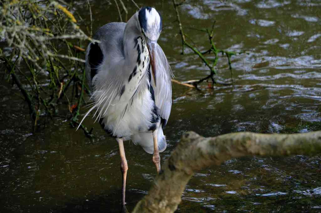 A Grey Heron on a grey day at Titchfield Haven viewed from the Harbour road bridge.