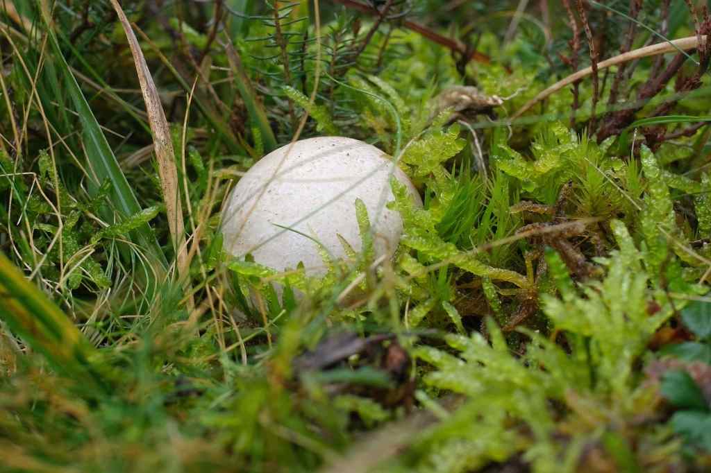 The ‘egg’ part of the fungi has the size and shape of a golf ball lying on the ground, but is attached to an underground network of mycelium threads by a long thick strand.