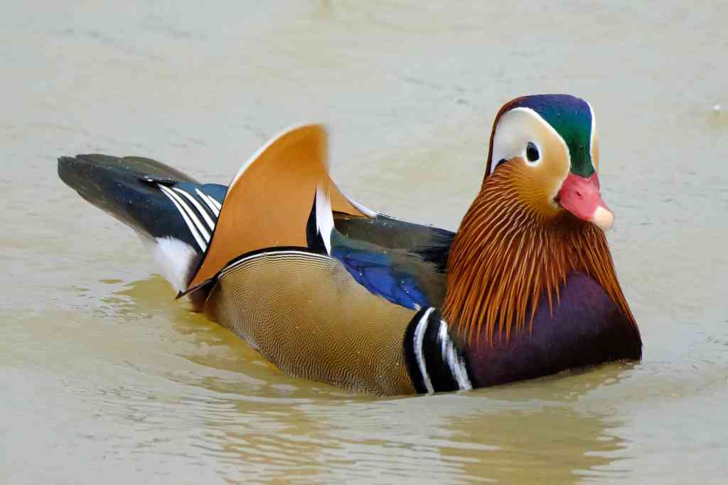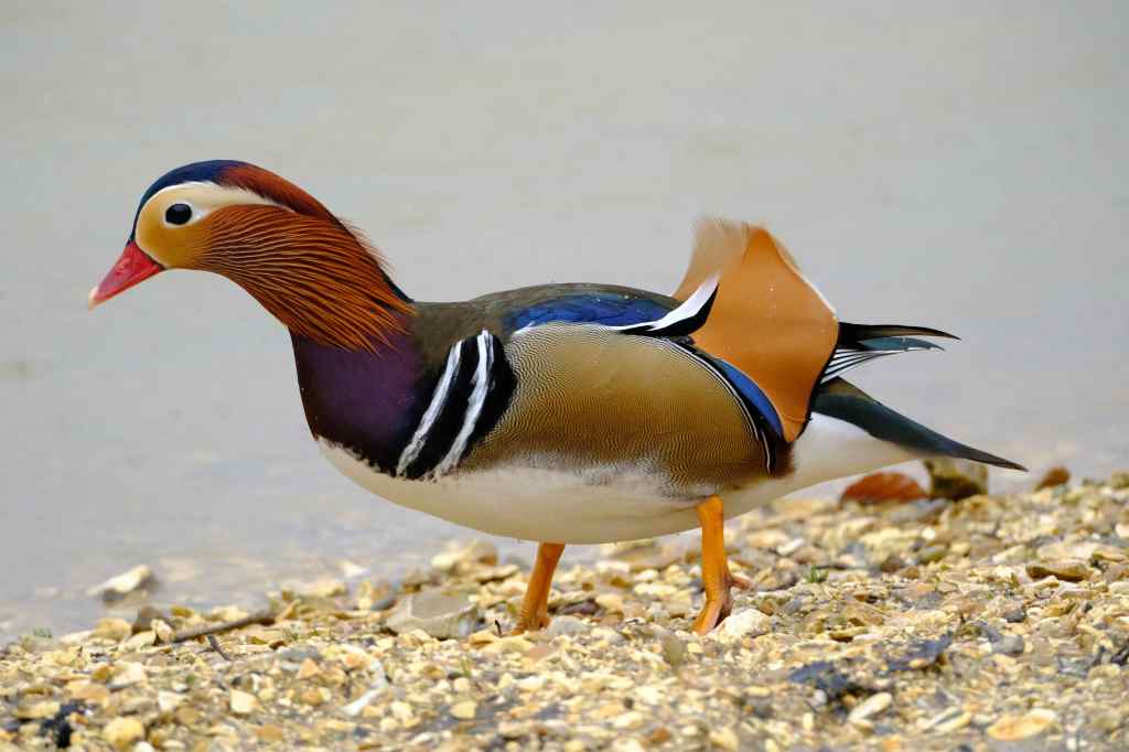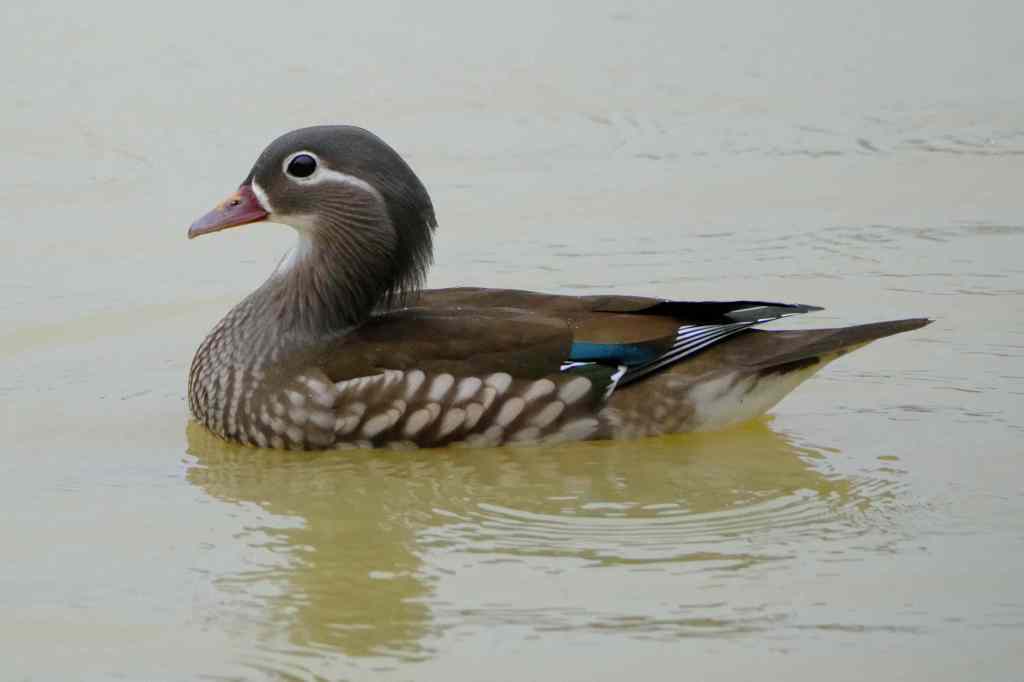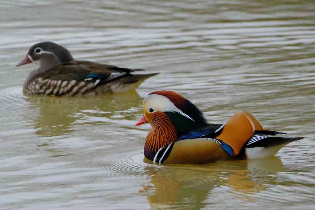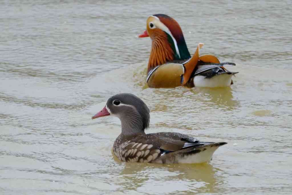 Mandarin Ducks were introduced from the Far East, They escaped, or were deliberately released, from captivity in the UK. A rather shy bird, often seen hiding beneath overhanging bushes, they form small flocks. The male bird has very elaborate and decorative plumage with distinctive orange feathers on the side of the face, a purple chest, and large orange feathers which look like small sails on its back. The female is not brightly coloured, with a grey head, white stripe behind the eye, brown back, and mottled lower sides. There was a flock of 10 birds today on the pond I visited today {the most I have seen there.}