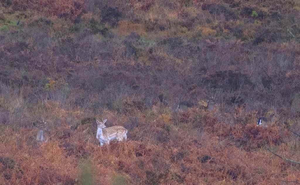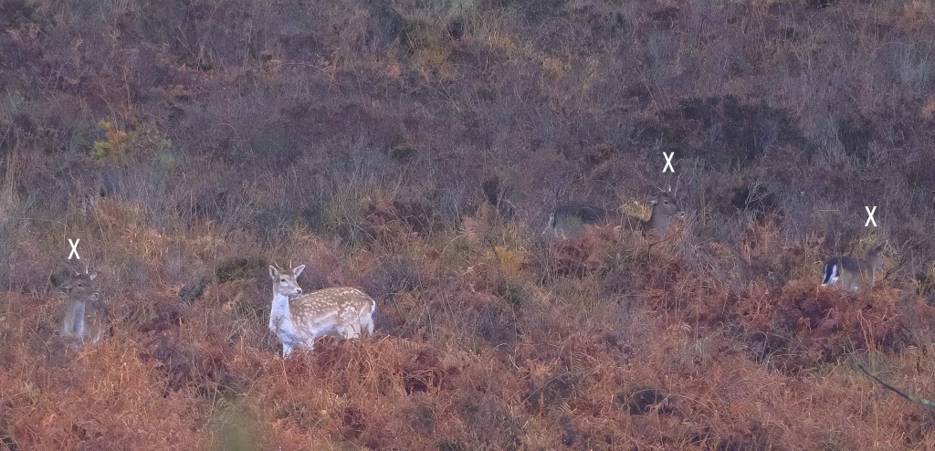 I spend a lot of time considering natures camouflage – some of the Fallow Deer in the forest are very pale in colour as this young buck is – he was easily spotted at quite a distance the 3 other darker deer are well hidden. I would not have seen any deer if the pale buck was not there!