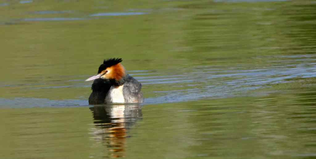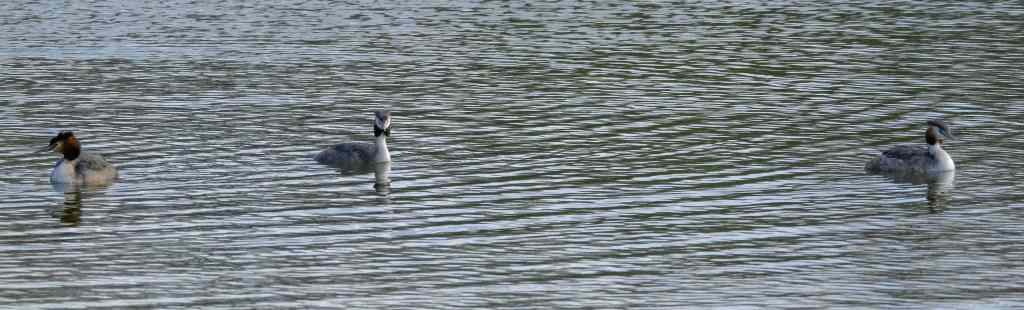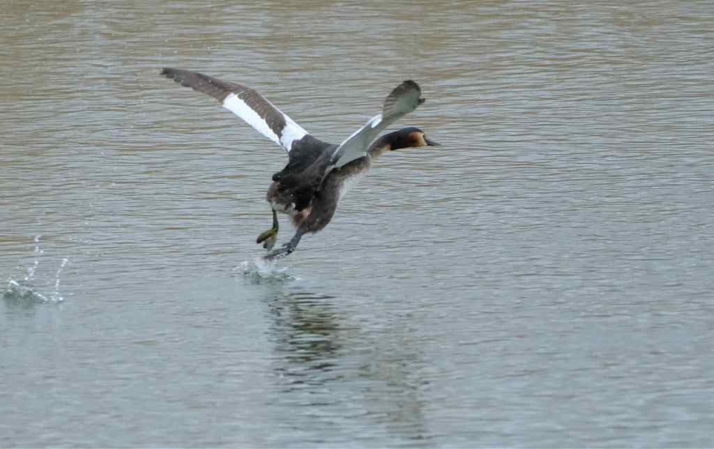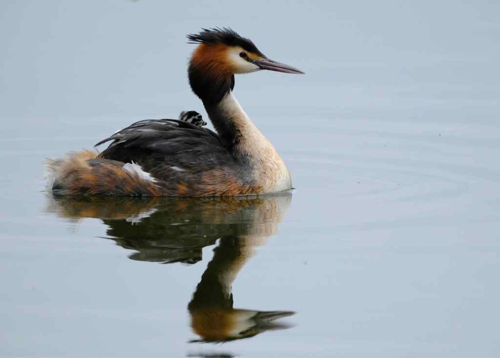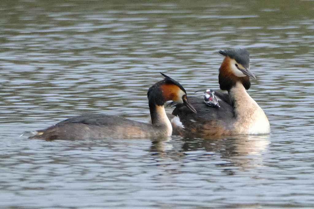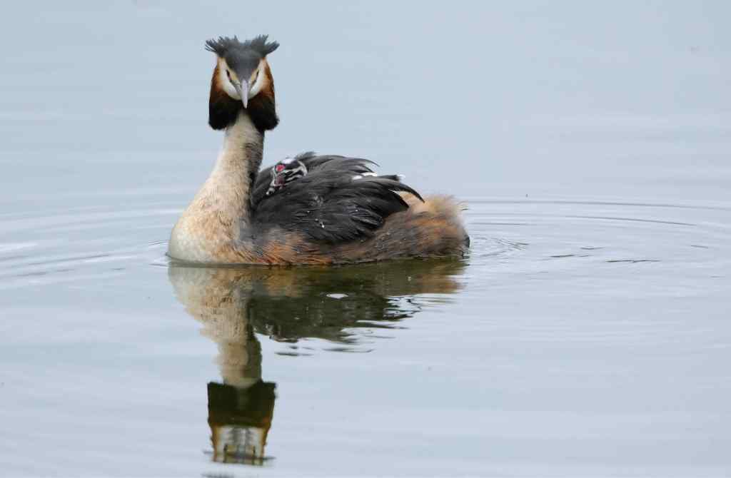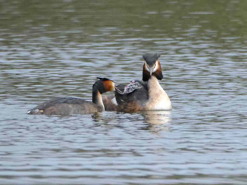 Since last week the Great Crested Grebes have hatched and left the nest. They are now riding on the back of the parent bird, while the other parent is catching small fish that he passes to the young Humbugs.
