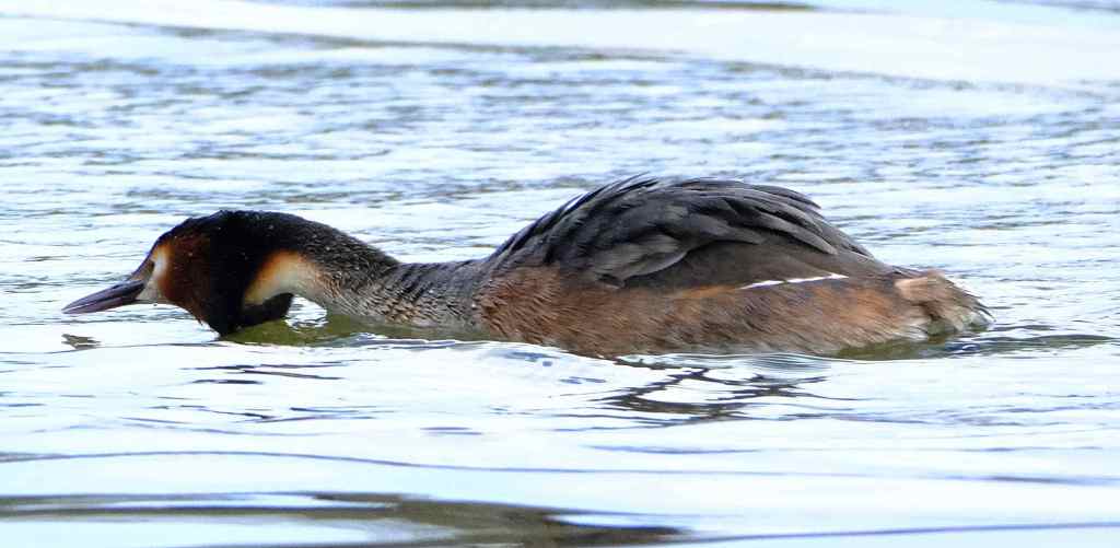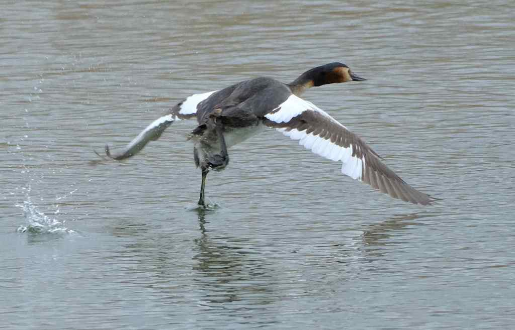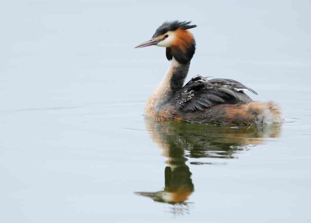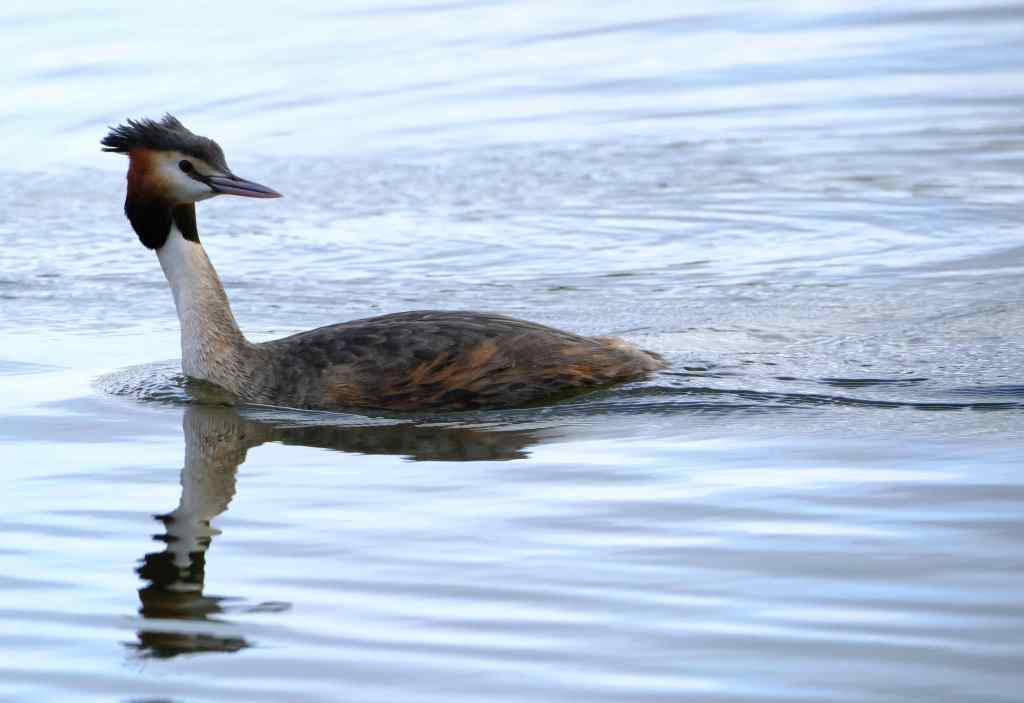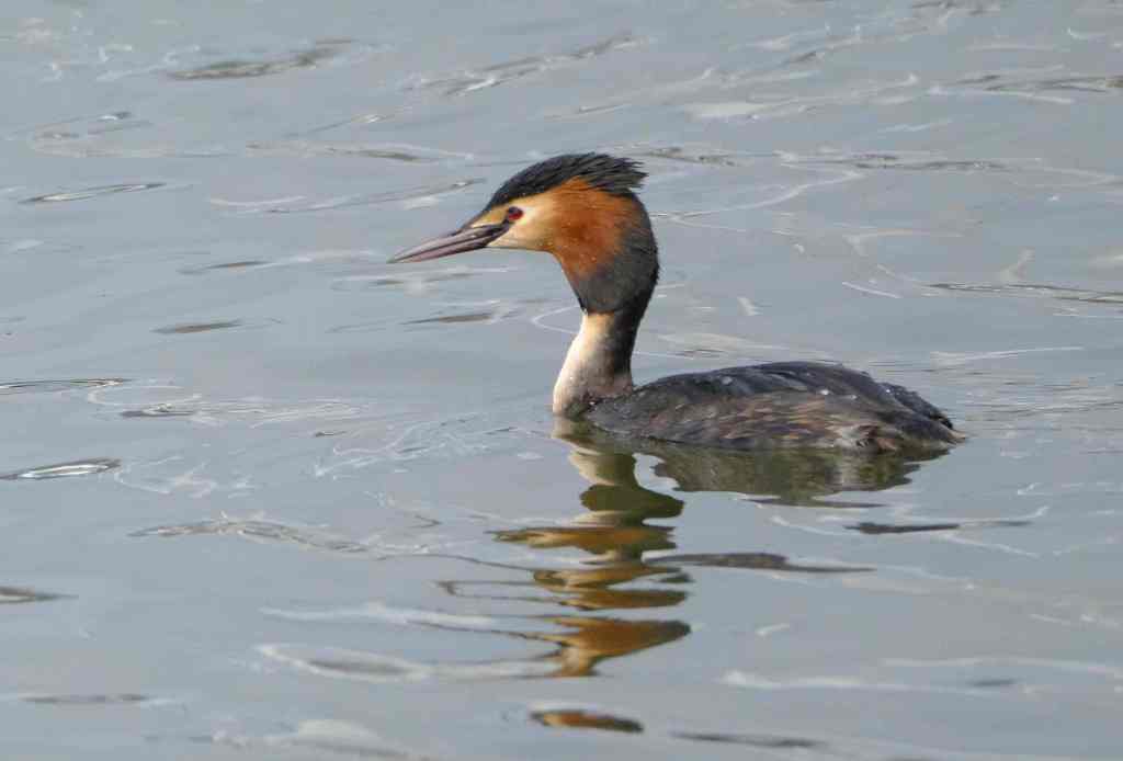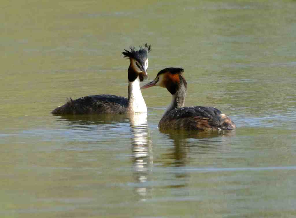 Since last week the Great Crested Grebes have hatched and left the nest. They are now riding on the back of the parent bird, while the other parent is catching small fish that he passes to the young Humbugs.