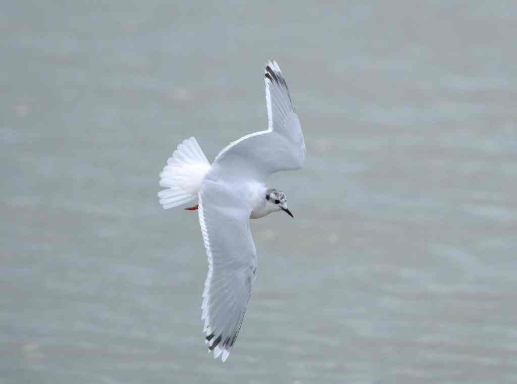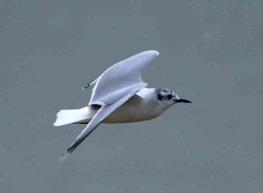 This small gull in summer the adults have black heads, while young birds have a black mark on each. In flight, adults show a pale grey upper wing, with no black wingtips, and a very dark grey underwing.