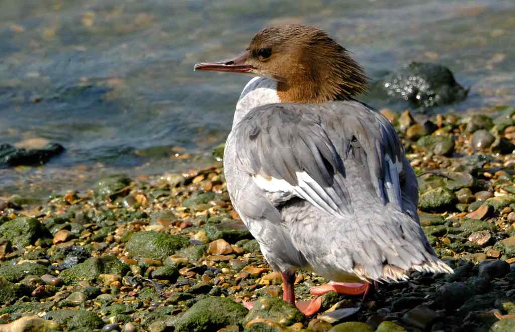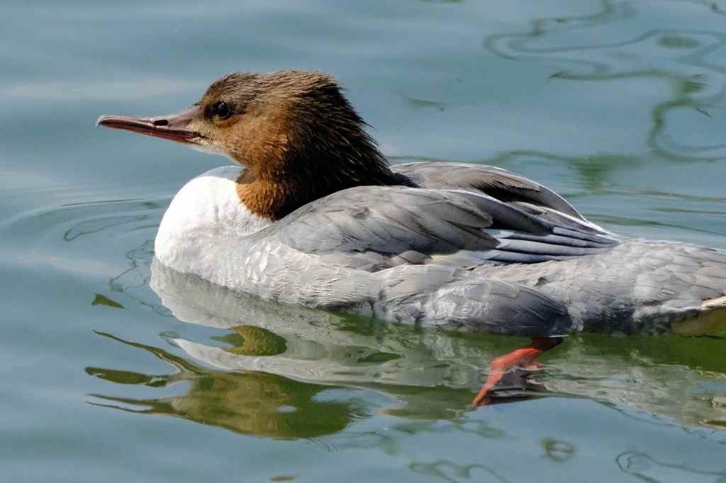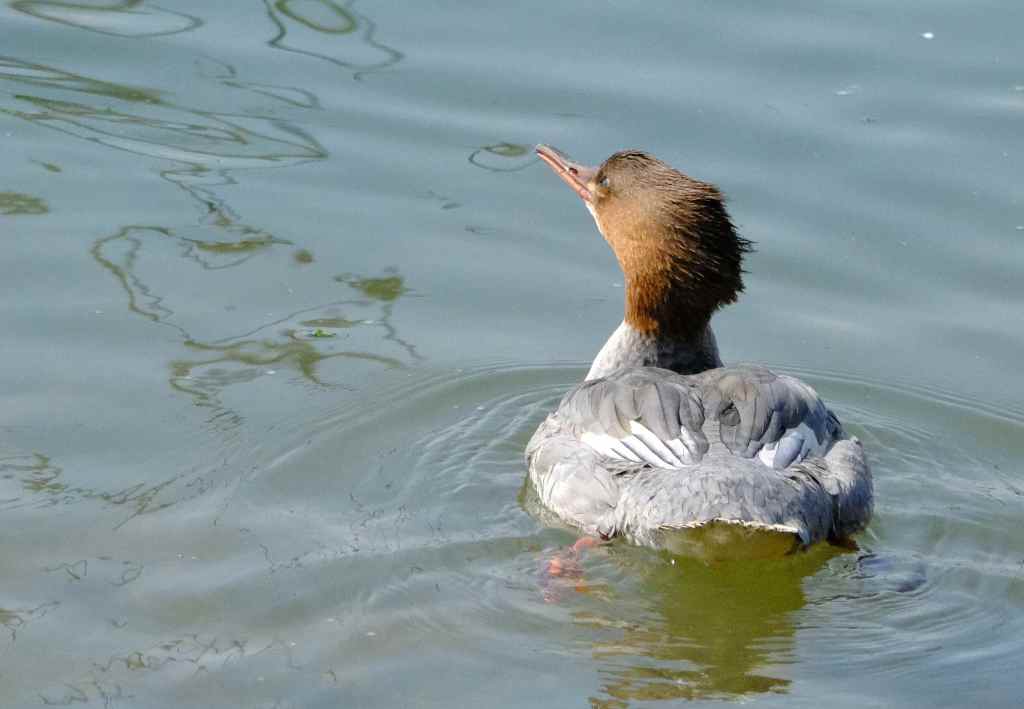 These diving ducks are a member of the sawbill family, named for their serrated bills, that they use to catch fish. A largely freshwater bird, they first bred in the UK in 1871. It built up numbers in Scotland and, since 1970, it has spread across northern England into Wales, reaching south-west England. Its love of salmon and trout has brought it into conflict with fishermen. This bird seen today in Titchfield Habour is a female (the male has a green head).