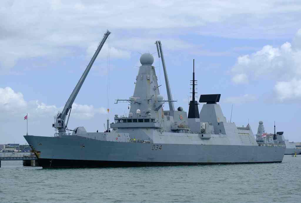 HMS Diamond D34 another Daring-class was undergoing replenishment, further in the dockyard.