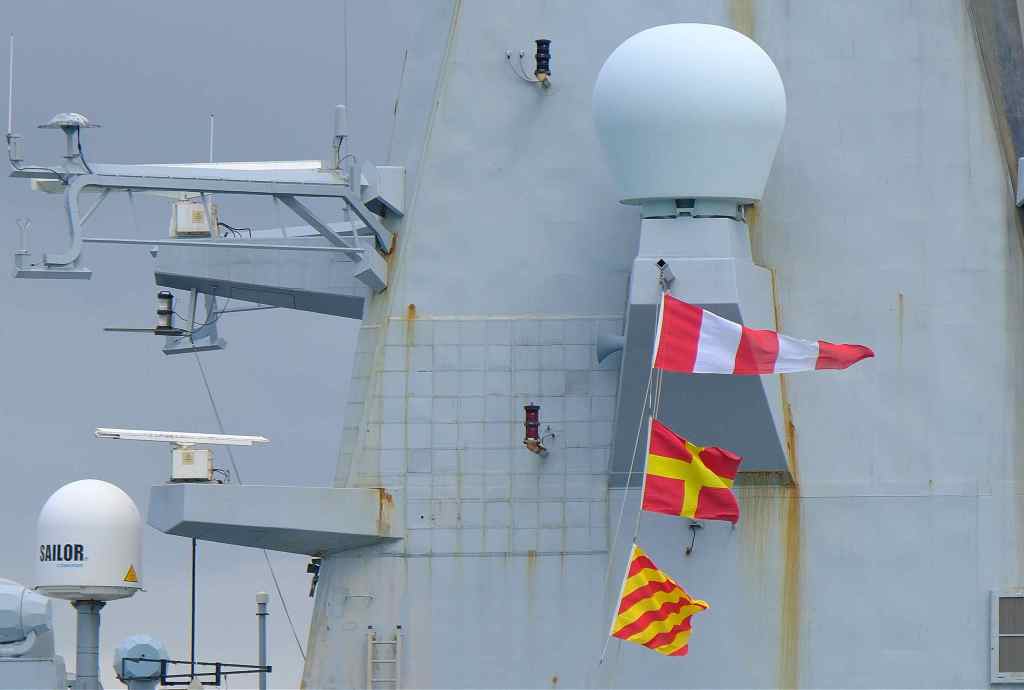 Note the barge with crane alongside, the signal flags read -top one CODE, then ROMEO then YANKEE – this means “slow down and no wash as you pass. The ship is being replenished.” I guess not munitions as no explosive flags were flying.