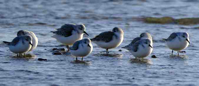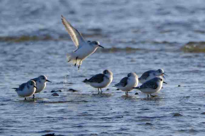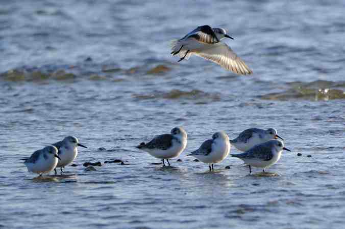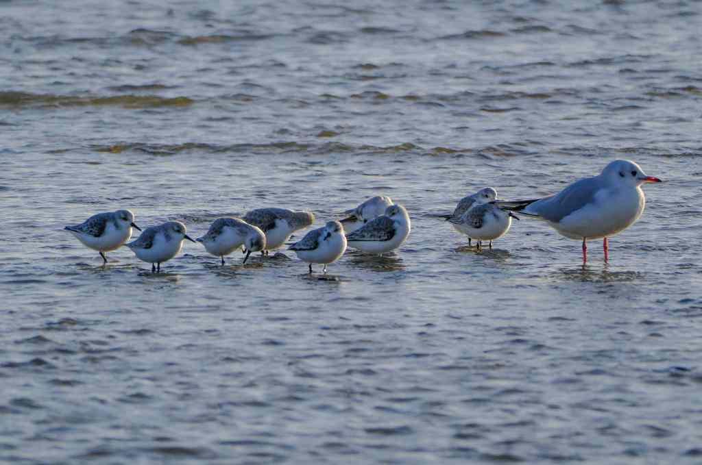 These Sanderling and lone Black-headed Gull are holding on as long as they can to a little island on the shore as the tide comes in.