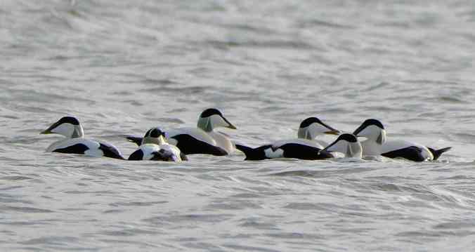 An eider raft is a large group of Eider Ducks that float close together on the sea. These rafts happen in the winter after they finish nesting. {Eider nest in the UK but are much further north than here} They stay close together to find food like shellfish and crustaceans by diving into the water