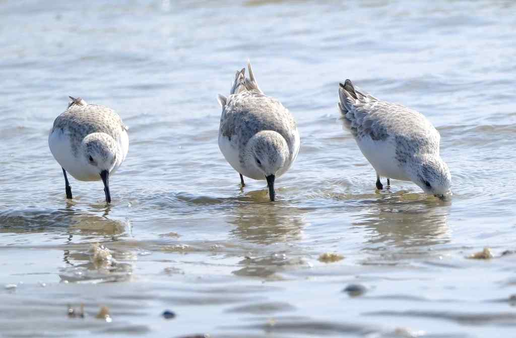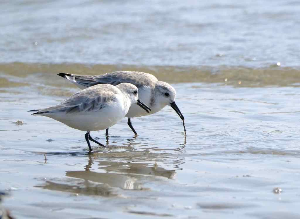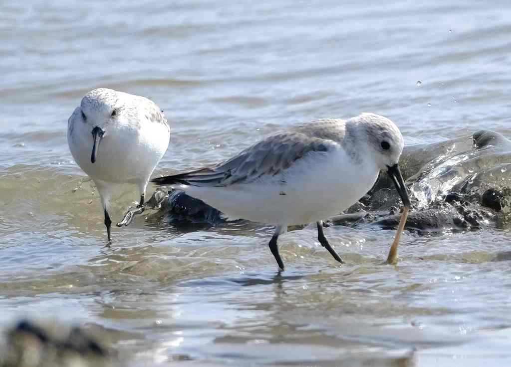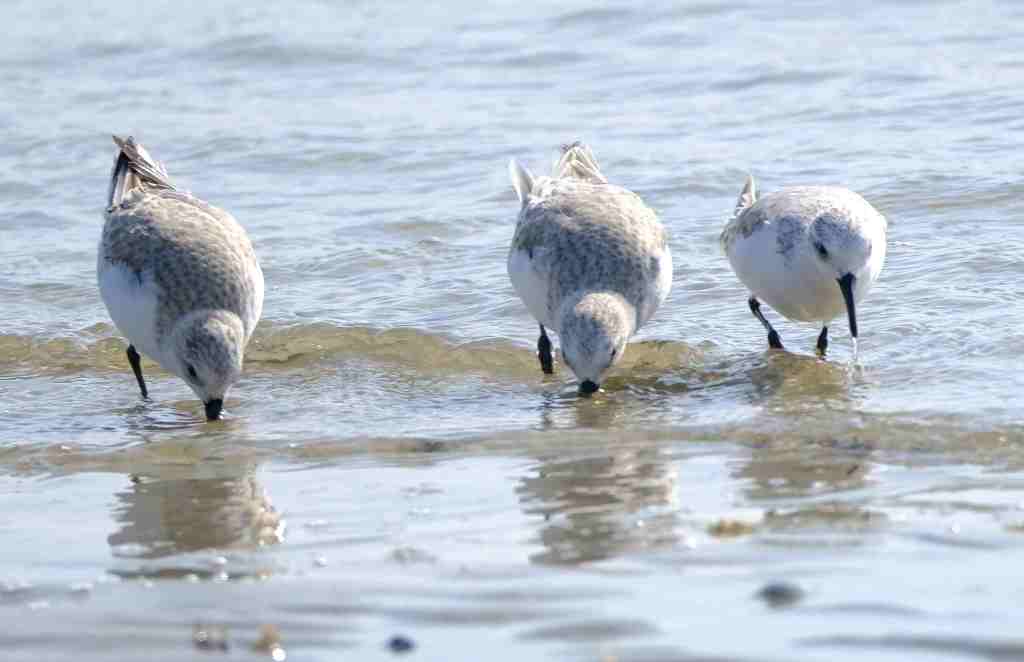 Groups of Sanderlings feed on small worms at low times on Meon Shore Hill Head. Like little clockwork robots, they run up and down, dodging both Black-heading gulls trying to get a free lunch and the incoming tide. These are my favorite shore birds, and I spend many hours watching them.
