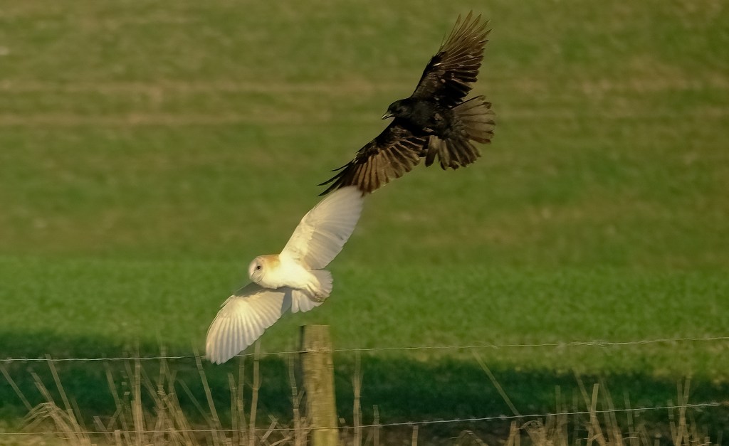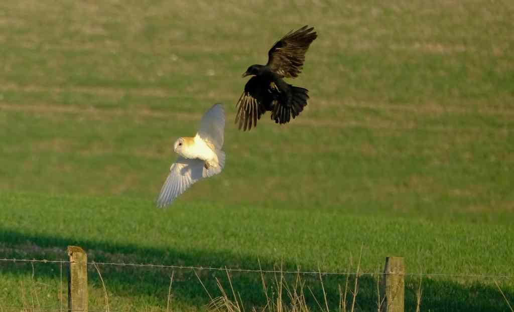 As with any Owl or Bird of prey; they are often mobbed by crows.