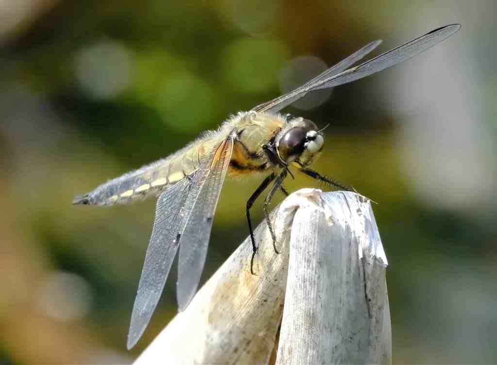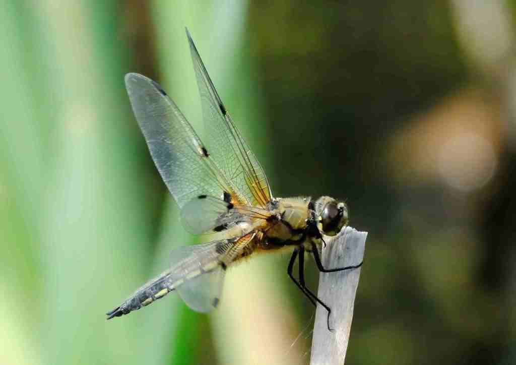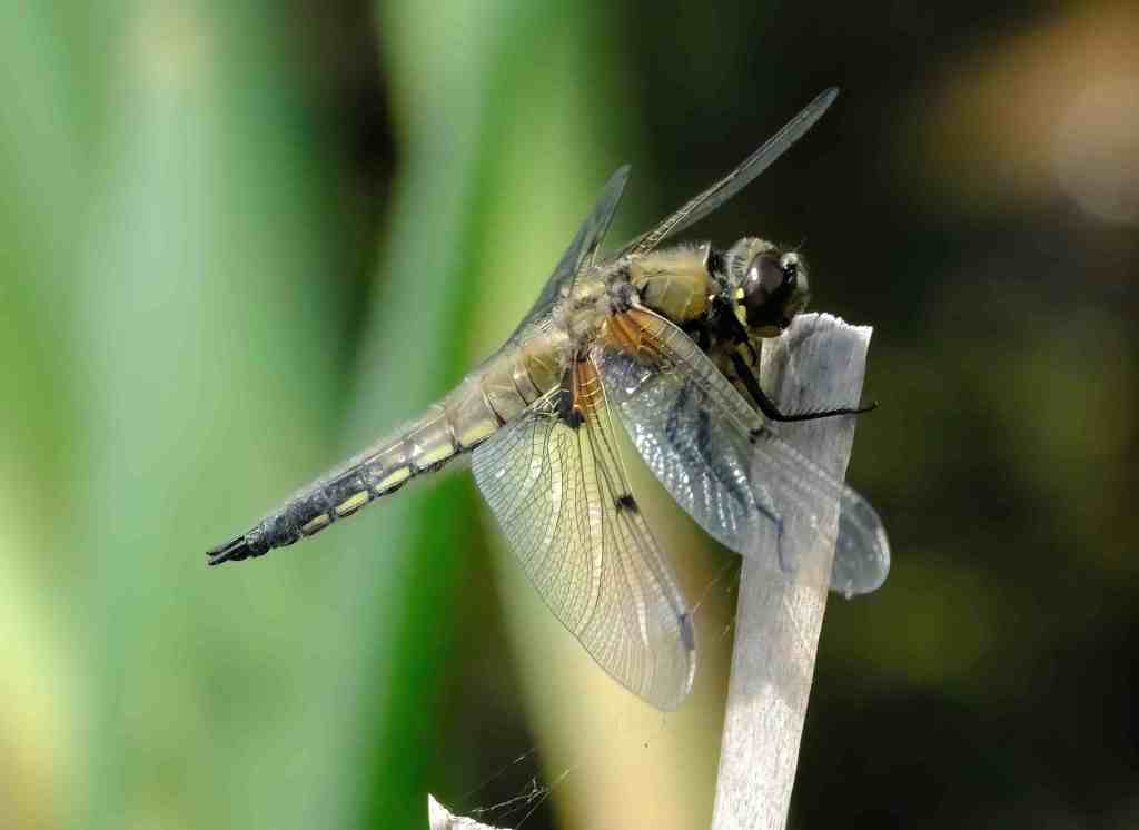The Four-spotted chaser dragonflies seen here at Titchfield Haven Nature Reserve are easily recognised. Each wing has two dark spots on the leading edge. These spots give this species its name.