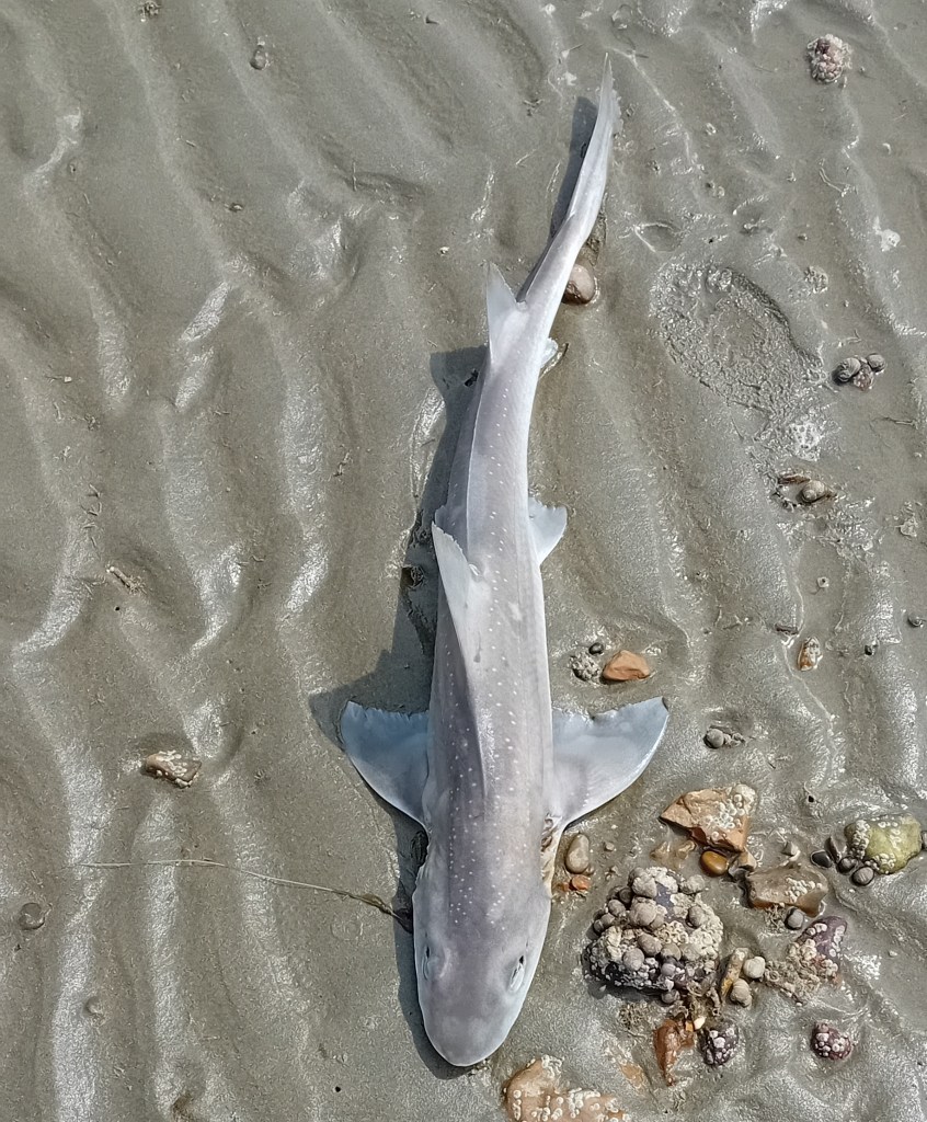A dead 3-foot shark on the beach – A Smooth Hound, also known as Grumpy Shark and a Smut. Listed as vulnerable by the International Union for Conservation of Nature. Sadly, fishing killed this fish. It was held in the water by 4 lead weights and 30 feet of broken fishing line.