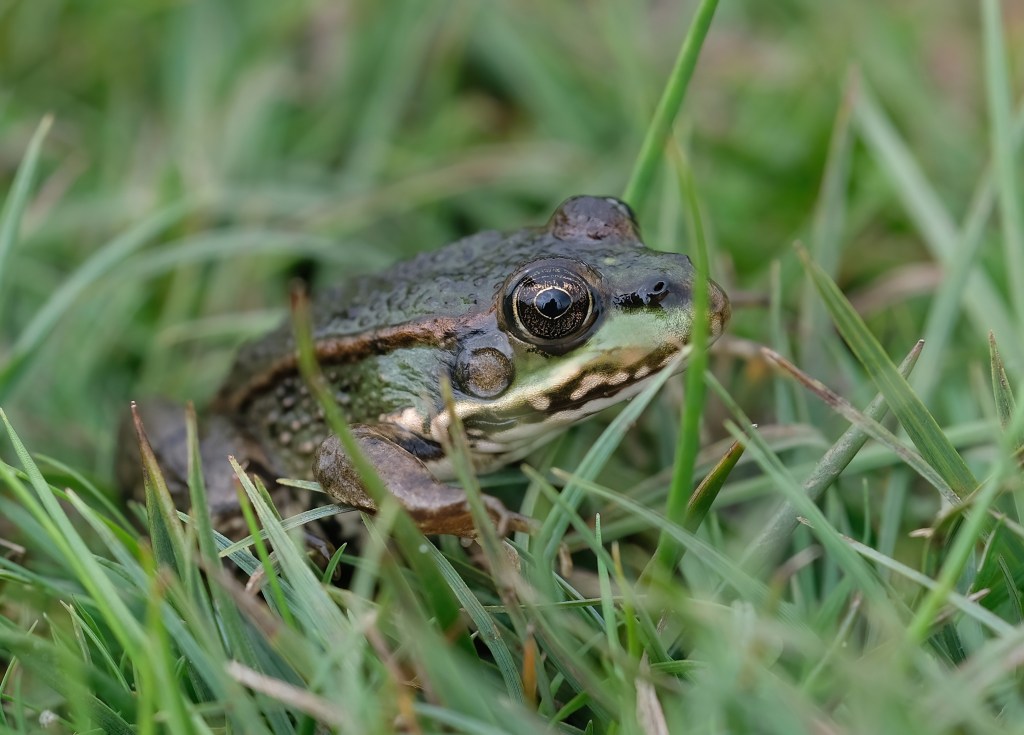 The marsh frog, a non-native species, was introduced to the UK in the 1930s, with populations establishing in Kent and spreading to other parts of southern England. While most common in the southeast, isolated populations have been recorded further north. Unlike our native frogs, they never stray too far from water. They either are in it, or sat close to it. They are alert and wary as you approach, they will launch themselves into and plop into the water. Last August, we watched a New Forest population.