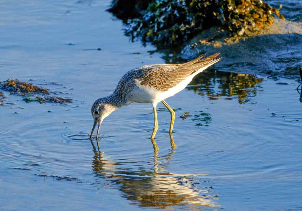 A Greenshank with a Spotted Redshank in winter plumage, fishing for small invertebrates.