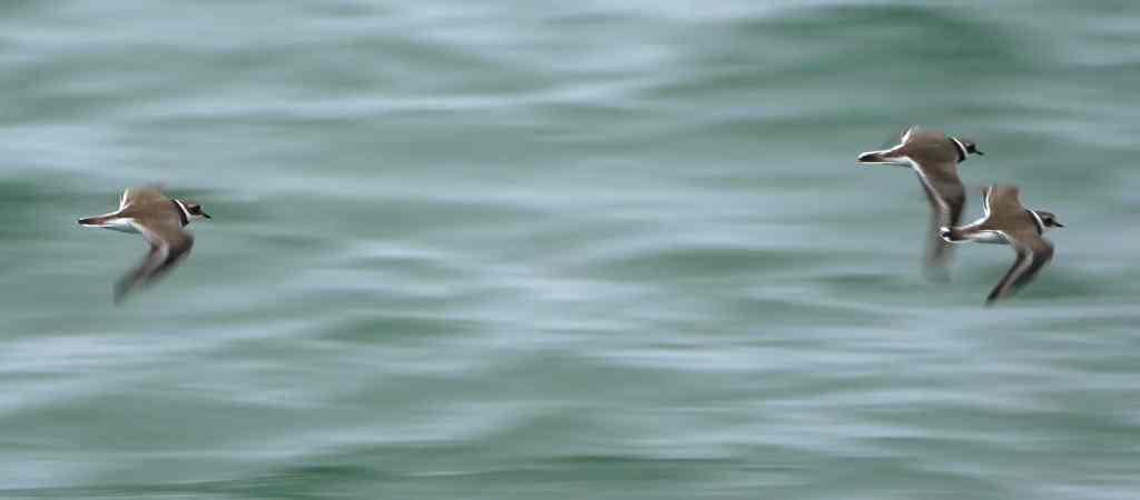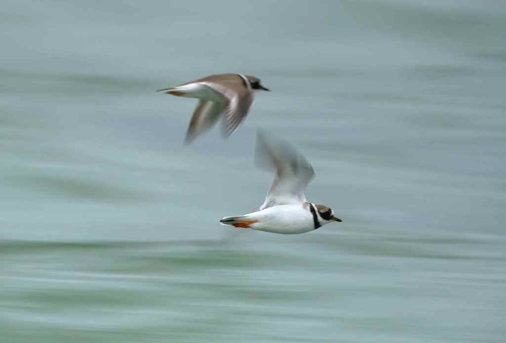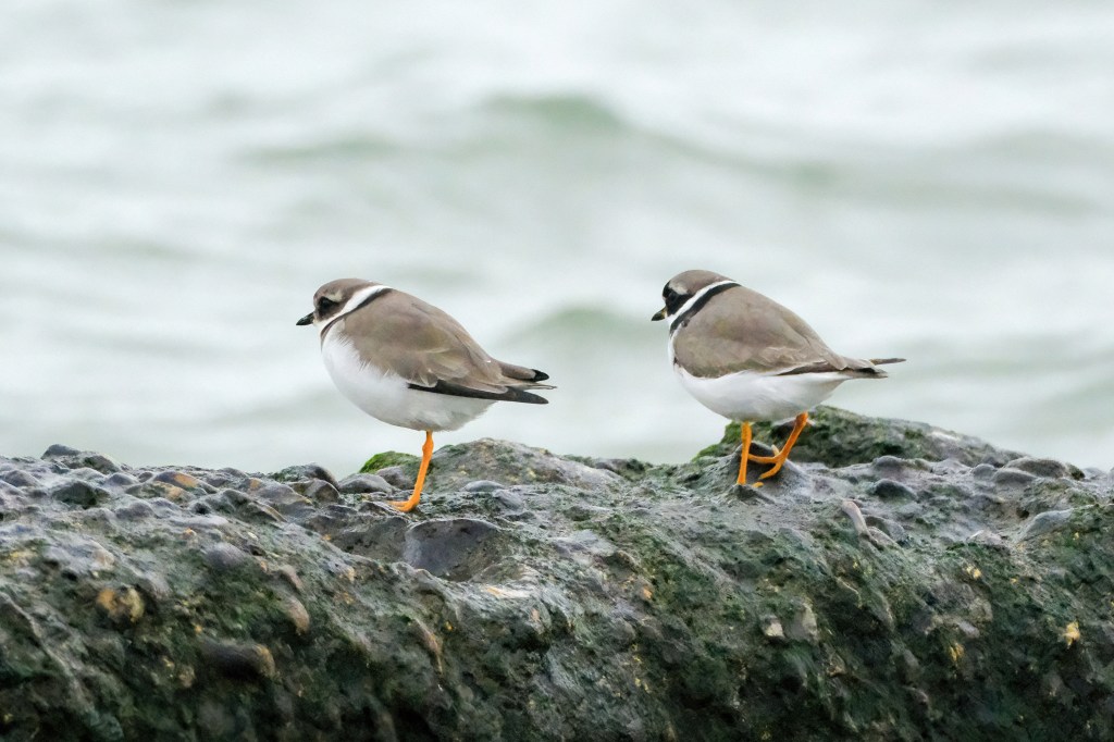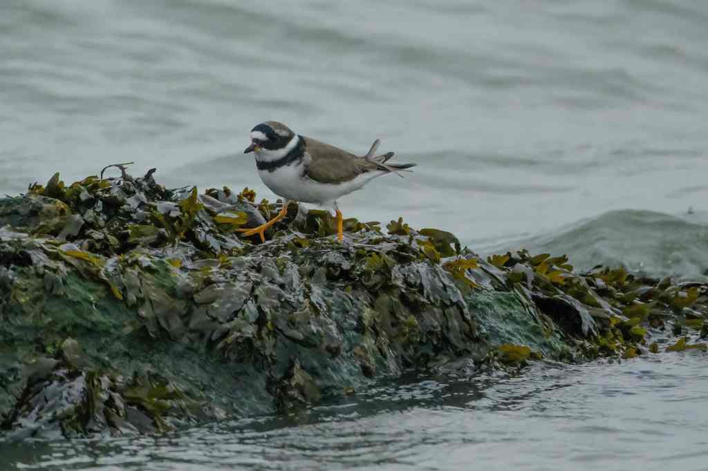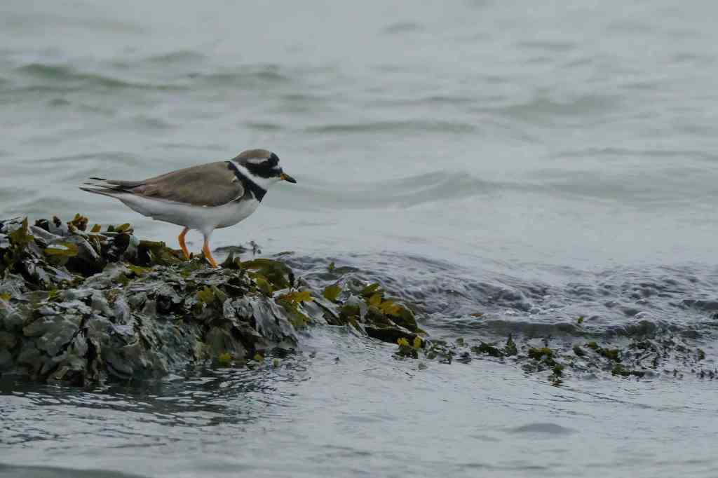 Ringed plovers are described as small and dumpy wading birds with orange legs and a black and white head and breast pattern. They can be seen foraging for small invertebrates and crustaceans in a characteristic “stand and watch, run, peck” pattern.