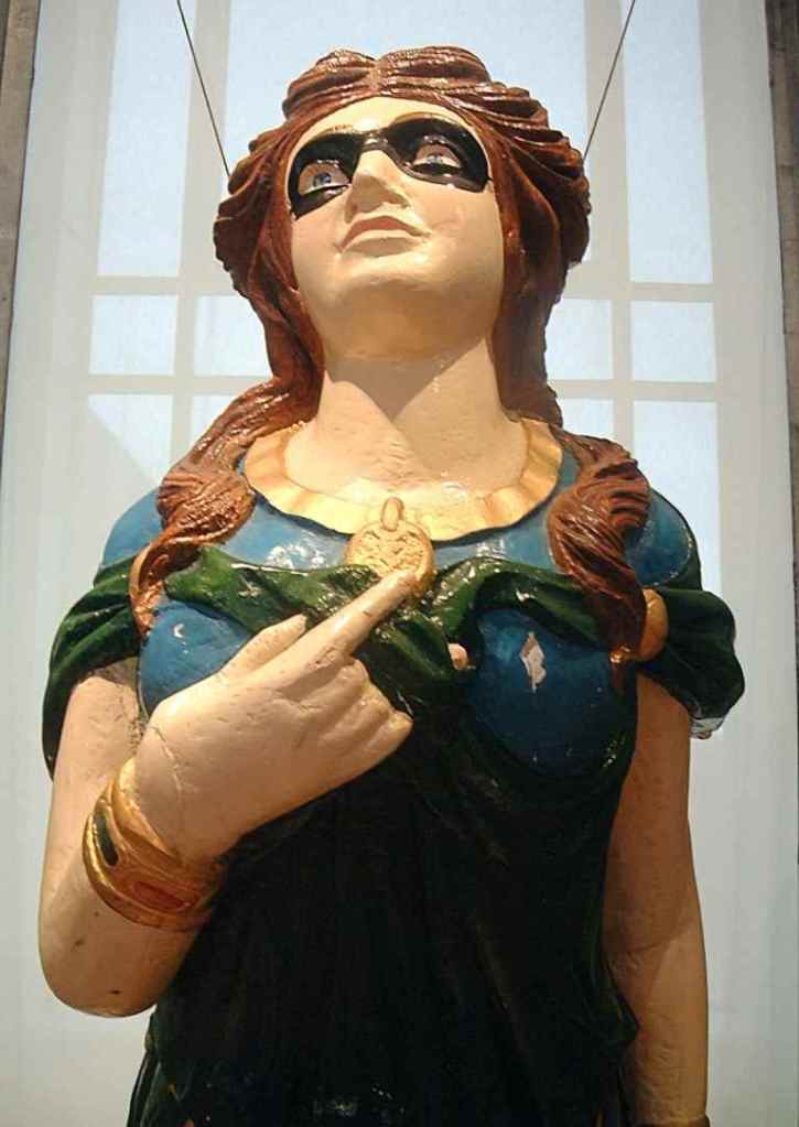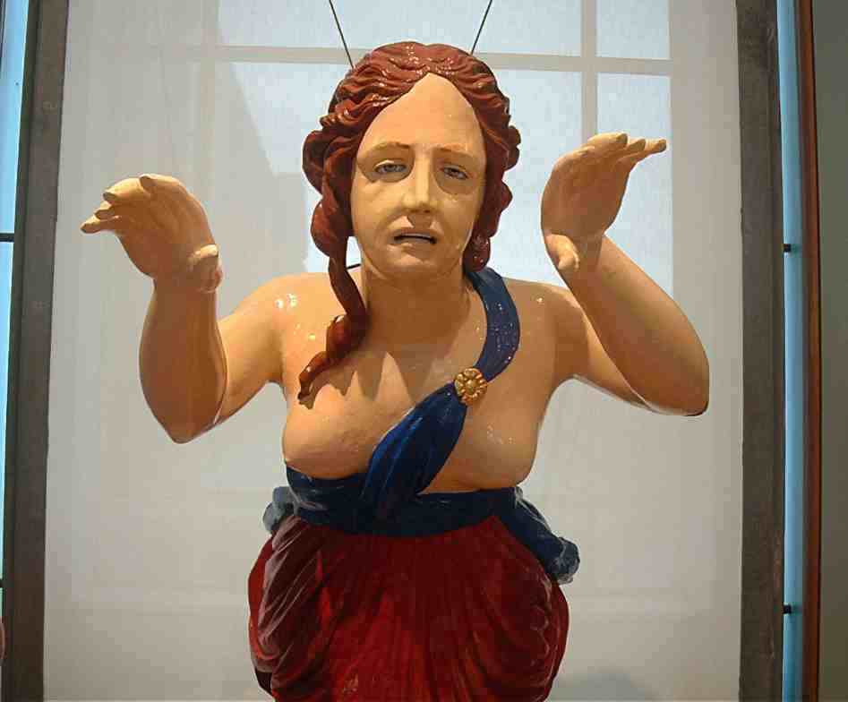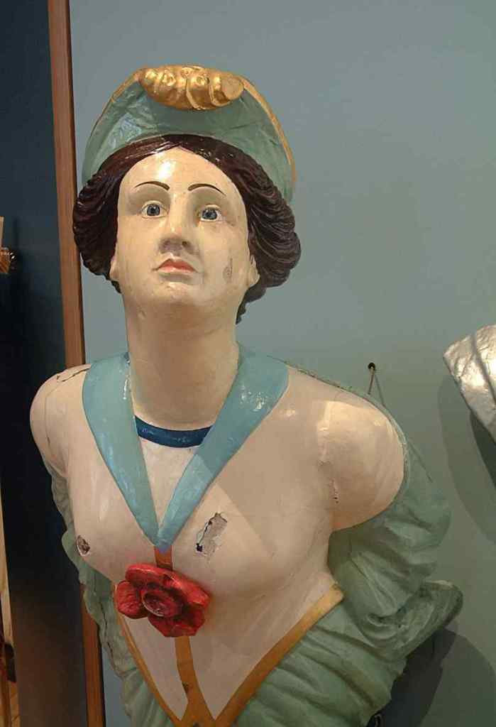 The last Royal Navy ship to showcase a figurehead was the HMS Espiegle. The name “L’Espiegle,” meaning frolicsome in French, aptly described the carved figurehead, which depicted a woman adorned with jewel-encrusted bangles and a striking masquerade mask. This artistic representation was meant to convey a sense of playfulness and allure, embodying the ship’s spirit. The HMS Espiegle was eventually broken up in 1923.