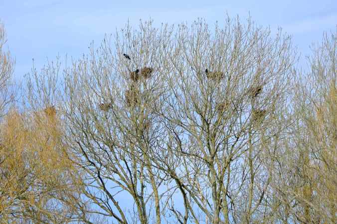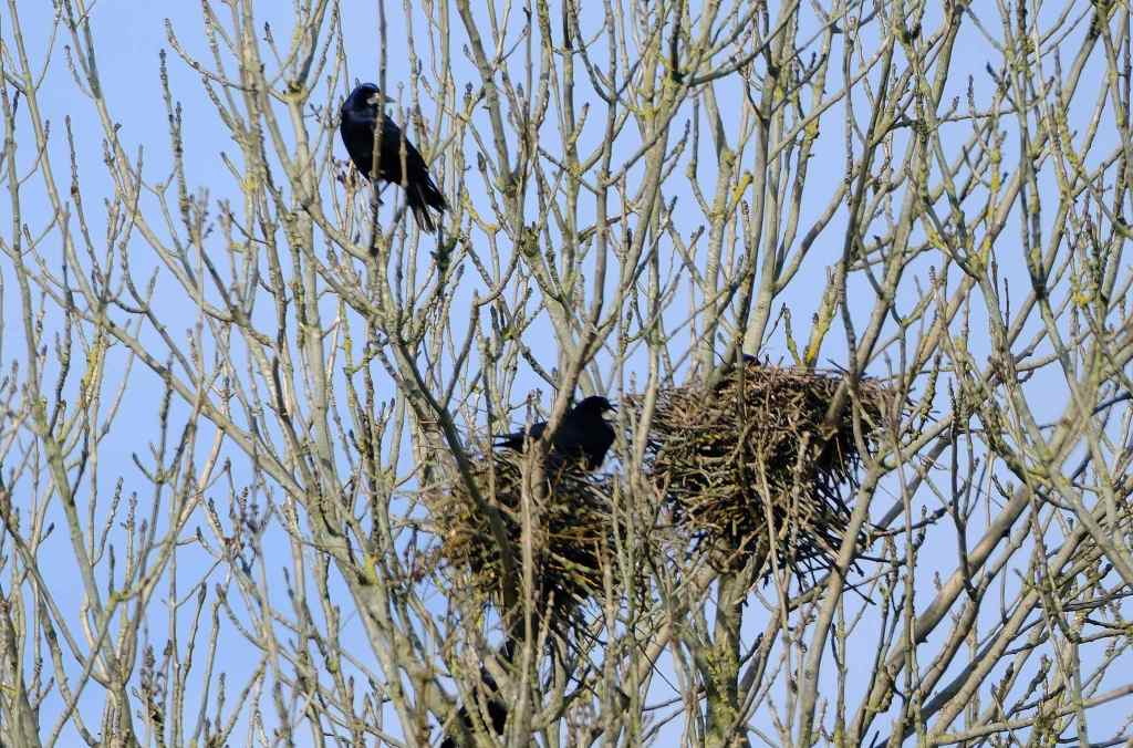 This time of year, Rooks are re-establishing their nest sites. Rookerys are known for high noise levels, territorial disputes, and intense activity during nesting season.