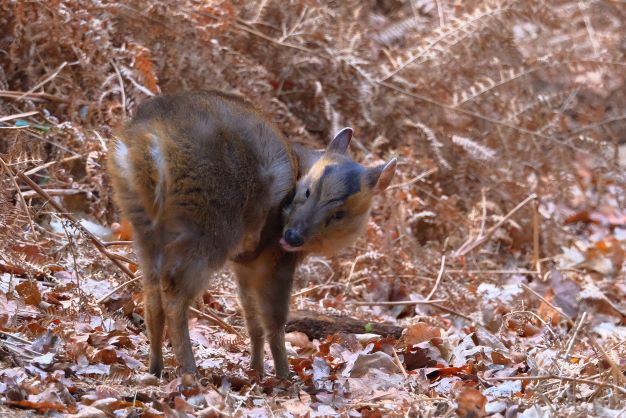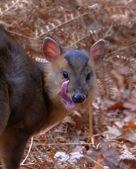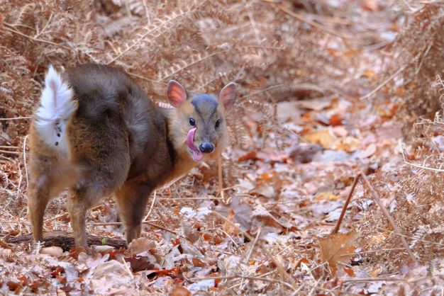 Muntjac is mainly a solitary deer. They use scent to communicate their territories. Individuals do this by rubbing the long v-shaped slits on their foreheads where their frontal glands are onto the ground or branches. They also have two large glands located just in front of the eyes, called the pre-orbital glands. Muntjac frequently lick these with their long tongues, this is thought to help them recognise their own scent.