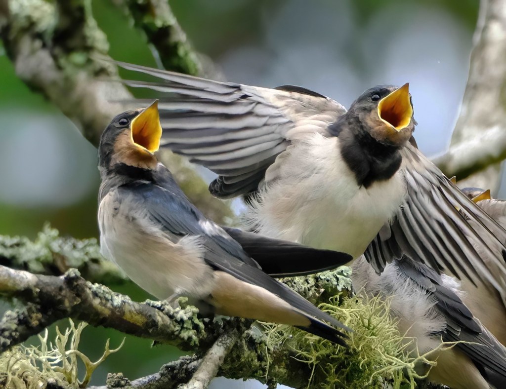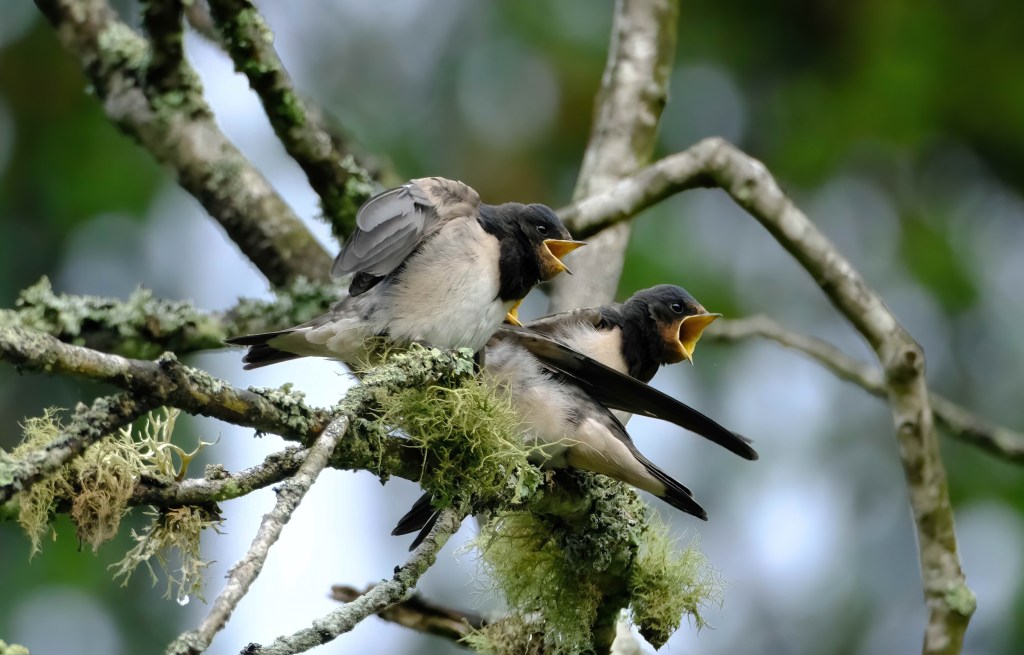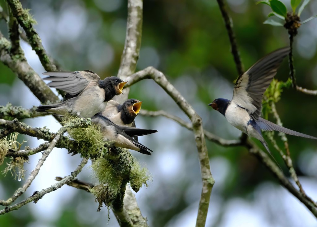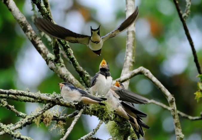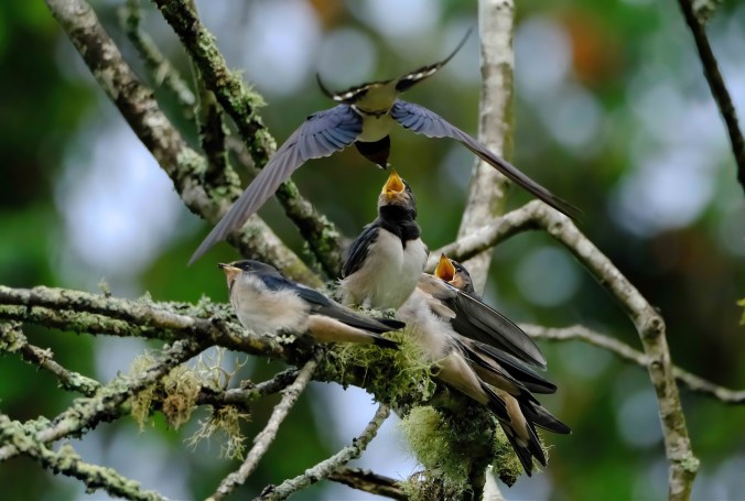 Swallows are small birds. They are extremely agile in flight and spend most of their time in the air. They are widespread breeding birds in the Northern Hemisphere and migrate south in winter. This family has left their nest and is being fed in a tree. They were a joy to watch on today’s walk in the New Forest.